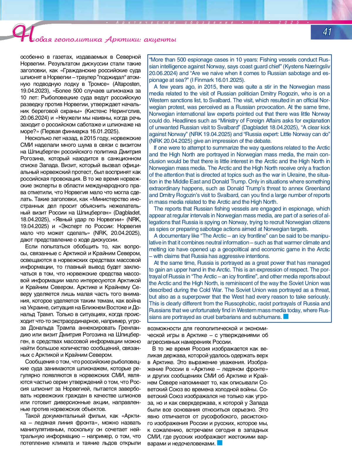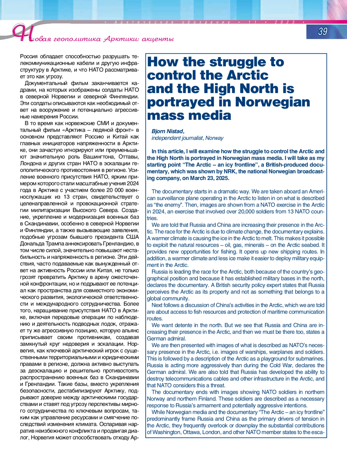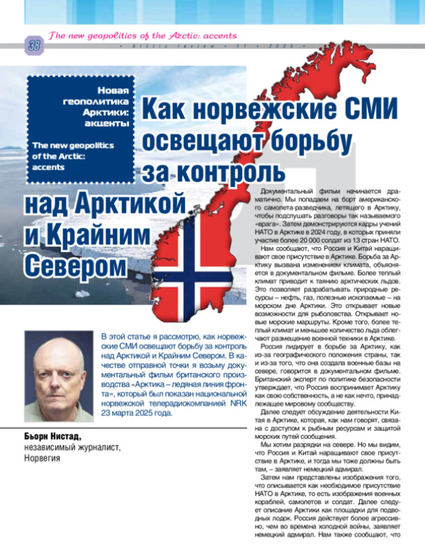 в этой статье я рассмотрю, как норвежские СМи освещают борьбу за контроль над Арктикой и Крайним Севером. в качестве отправной точки я возьму документальный фильм британского производства «Арктика – ледяная линия фронта», который был показан национальной норвежской телерадиокомпанией nrk 23 марта 2025 года.