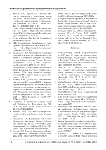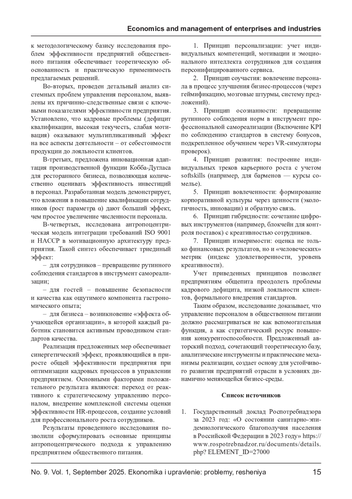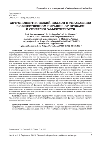 Повышение эффективности предприятий общественного питания требует модернизации управления персоналом вследствие ужесточения конкуренции, кадрового дефицита, цифровизации процессов, роста требований к качеству услуг. Исследование базируется на последовательном доказательстве положения о том, что управление персоналом является стратегическим фактором эффективности, а не вспомогательной функцией. Многоуровневый подход к исследованию методологии эффективности предприятий общественного питания позволяет создать целостную систему механизмов управления эффективностью. Анализ проблем управления персоналом предприятий общепита выявил их системное влияние на показатели эффективности. Оптимизация кадровых процессов позволяет сформировать устойчивую основу для развития бизнеса на основе внедрения ISO и HACCP. В качестве предложения по развитию аналитических методов управления персоналом рассмотрена инновационная адаптация производственной функции Кобба-Дугласа для ресторанного бизнеса, позволяющая количественно оценивать эффективность инвестиций в персонал. Доказано, что оптимизация кадровых процессов создает синергетический эффект, затрагивая другие функциональные области. Установлено, что кадровые проблемы оказывают мультипликативный эффект на все аспекты деятельности предприятия: от себестоимости продукции до лояльности клиентов. Концепция стратегического антропоцентризма, положенная в основу исследования, трансформирует управление персоналом из вспомогательной функции в драйвер инноваций, обеспечивая устойчивое конкурентное преимущество через развитие человеческого капитала как ключевого актива предприятия, персонализацию подходов к мотивации, создание условий для профессиональной самореализации. Результаты исследования имеют практическую значимость для повышения операционной и финансовой эффективности предприятий отрасли.
