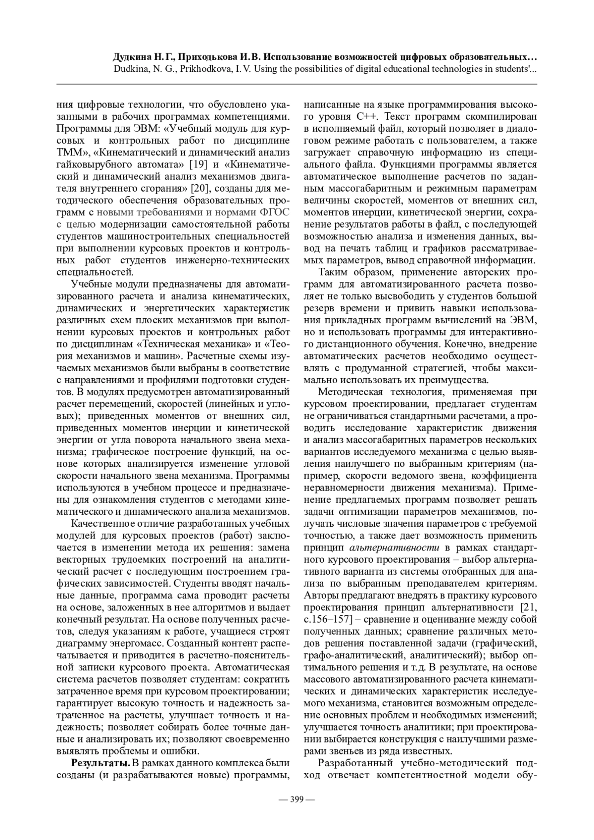 Рассматривается использование возможностей цифровых образовательных технологий в научно-исследовательской работе учащихся инженерных специальностей. Предлагается методическая технология использования учебных модулей (авторских программ для ЭВМ) по курсовому проектированию дисциплины «Теория механизмов и машин» для исследовательской работы студентов. Описаны структура разработанной программы и алгоритм действий студентов при решении прикладных задач дисциплины и компьютеризированных научных исследованиях. Методическая разработка способствует получению необходимых компетенций для ведения успешной исследовательской деятельности студентов машиностроительных специальностей.