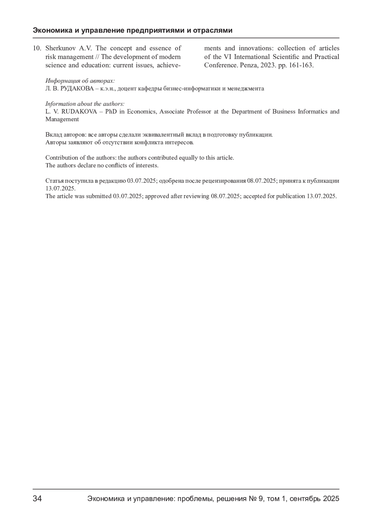 РУДАКОВА Л. В. СИСТЕМНЫЙ МЕТОД УПРАВЛЕНИЯ РИСКАМИ В ПРЕДПРИНИМАТЕЛЬСКИХ СТРУКТУРАХ // ЭКОНОМИКА И УПРАВЛЕНИЕ: ПРОБЛЕМЫ, РЕШЕНИЯ. 2025. ТОМ 1 № 9