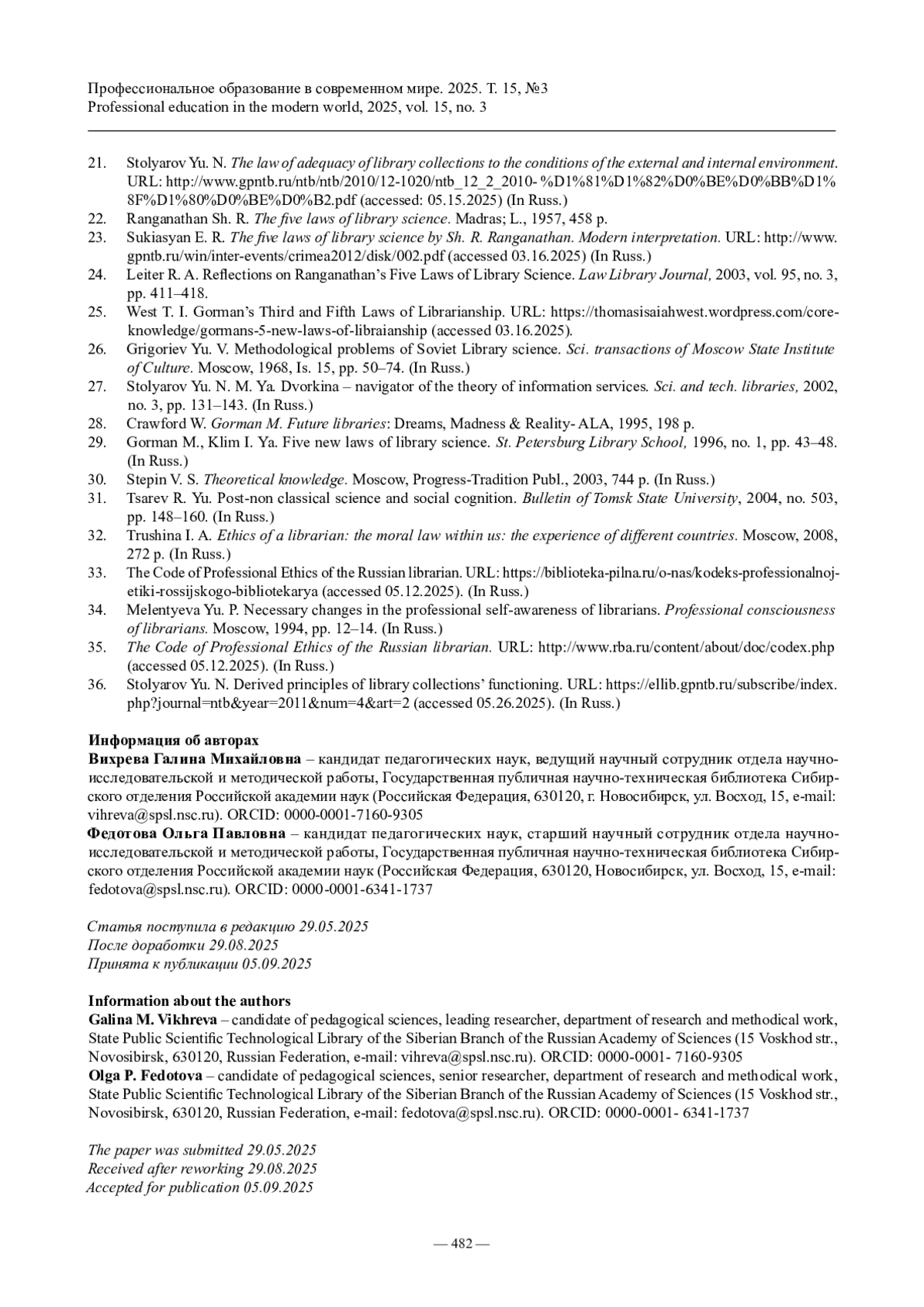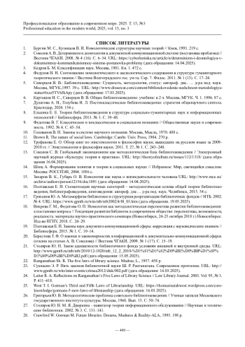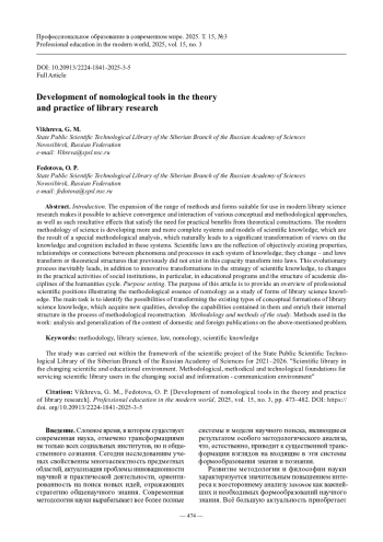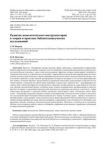 ВИХРЕВА Г. М., ФЕДОТОВА О. П. РАЗВИТИЕ НОМОЛОГИЧЕСКОГО ИНСТРУМЕНТАРИЯ В ТЕОРИИ И ПРАКТИКЕ БИБЛИОТЕКОВЕДЧЕСКИХ ИССЛЕДОВАНИЙ // ПРОФЕССИОНАЛЬНОЕ ОБРАЗОВАНИЕ В СОВРЕМЕННОМ МИРЕ. 2025. Т. 15, № 3