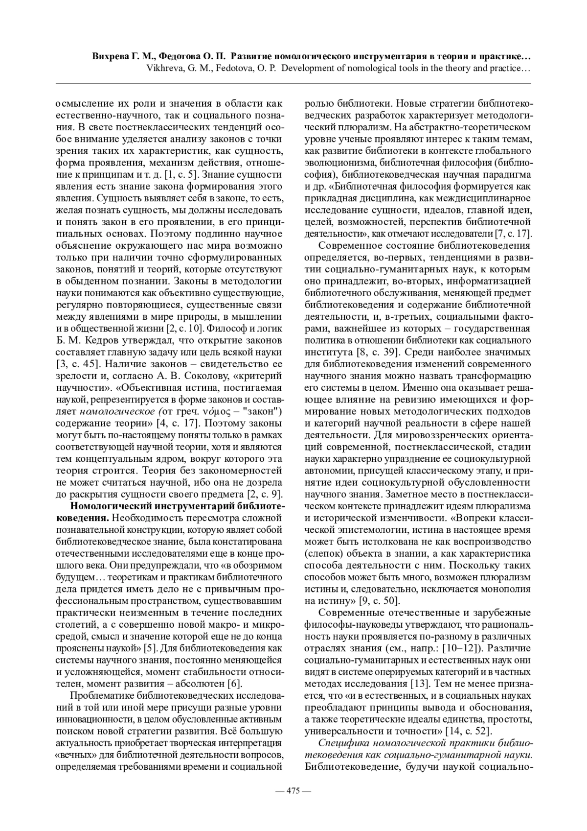Введение. Расширение спектра методов и форм, пригодных к применению в современных библиотековедческих исследованиях, позволяет достичь сближения и взаимодействия различных концептуально-методологических подходов, а также таких результативных эффектов, которые удовлетворяют потребность в практической отдаче от теоретических построений. Современная методология науки вырабатывает все более полные системы и модели научного знания, являющиеся результатом особого методологического анализа, что, естественно, приводит к существенной трансформации взглядов на входящие в эти системы формообразования знания и познания. Научные законы являются отражением объективно существующих в каждой системе знания свойств, отношений или связей между явлениями и процессами; меняются они – трансформируются законы, либо в законы преобразуются теоретические структуры, которые раньше не существовали в этом качестве. Данный эволюционный процесс неизбежно ведет, помимо инновационных преобразований в стратегии научного познания, к изменениям в практической деятельности социальных институтов, в частности – в образовательных программах и структуре учебных дисциплин гуманитарного цикла. Постановка задачи.