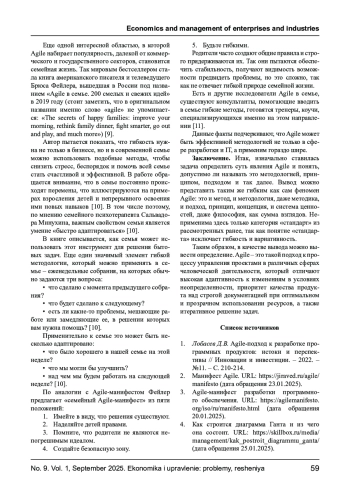 1. Лобасев Д.В. Agile-подход к разработке программных продуктов: истоки и перспективы // Инновации и инвестиции. - 2022. - №11. - С. 210-214. EDN: ORMBIK