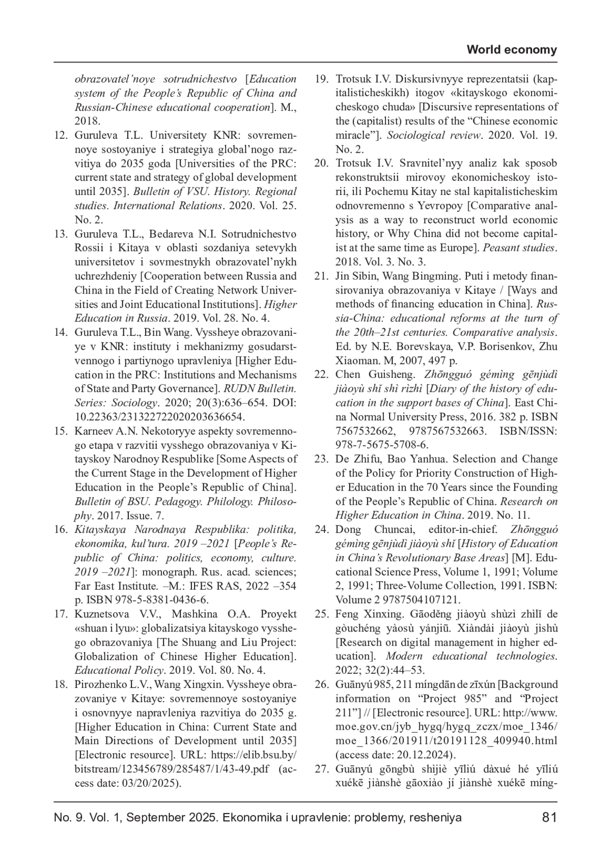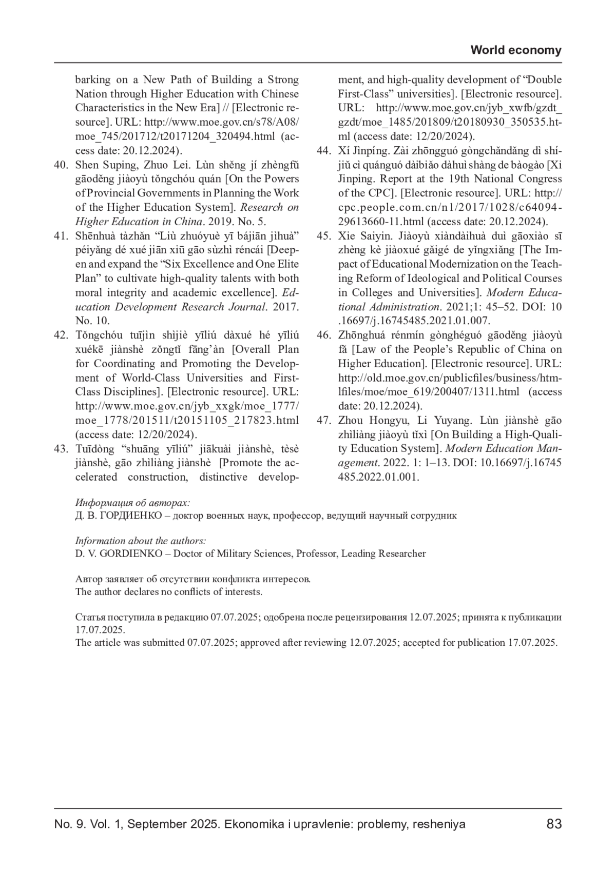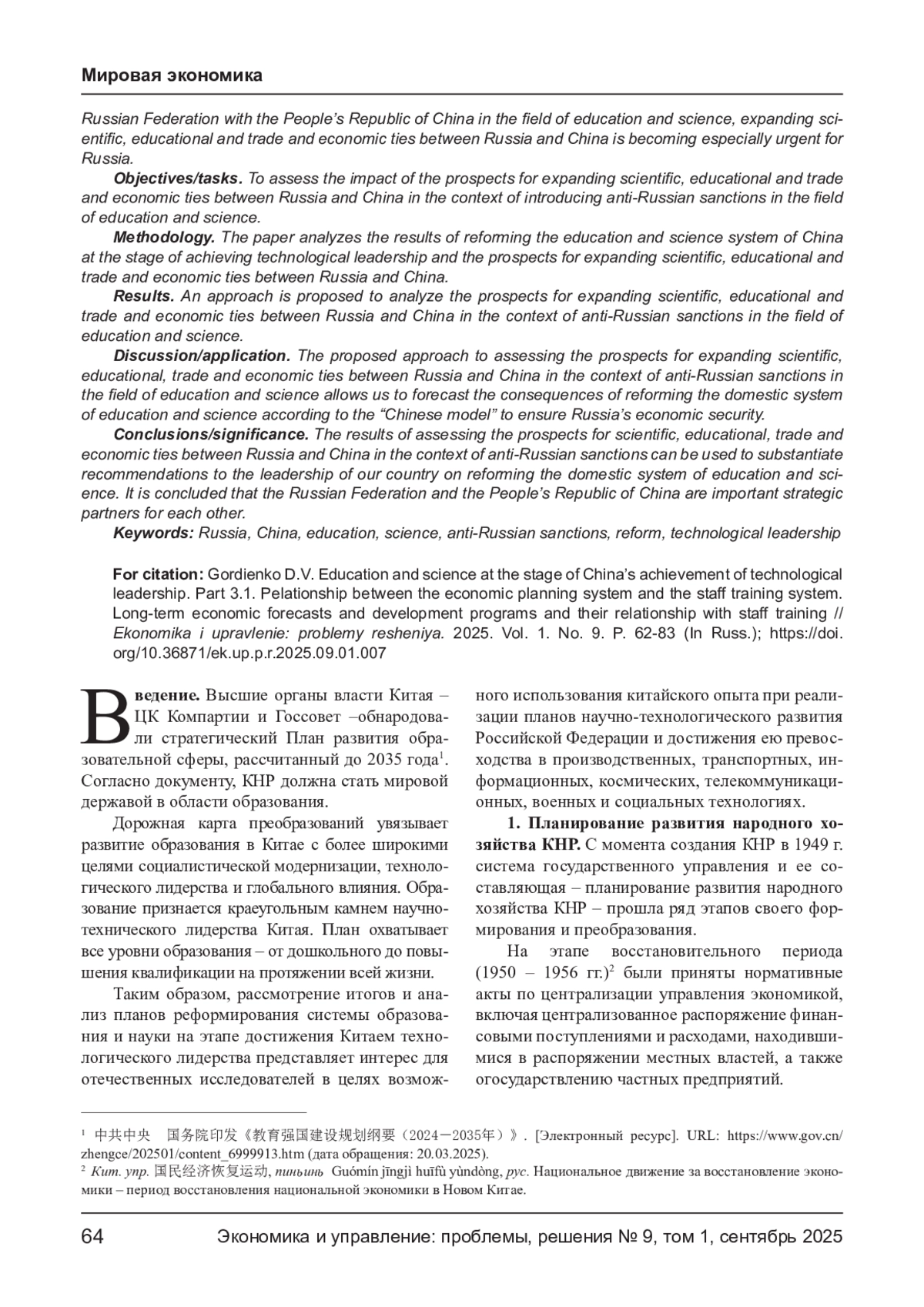 ГОРДИЕНКО Д. В. ОБРАЗОВАНИЕ И НАУКА НА ЭТАПЕ ДОСТИЖЕНИЯ КИТАЕМ ТЕХНОЛОГИЧЕСКОГО ЛИДЕРСТВА. ЧАСТЬ 3.1. СВЯЗЬ СИСТЕМЫ ПЛАНИРОВАНИЯ ЭКОНОМИКИ И СИСТЕМЫ ПОДГОТОВКИ КАДРОВ. ДОЛГОСРОЧНЫЕ ЭКОНОМИЧЕСКИЕ ПРОГНОЗЫ И ПРОГРАММЫ РАЗВИТИЯ И ИХ СВЯЗЬ С ПОДГОТОВКОЙ КАДРОВ // ЭКОНОМИКА И УПРАВЛЕНИЕ: ПРОБЛЕМЫ, РЕШЕНИЯ. 2025. ТОМ 1 № 9