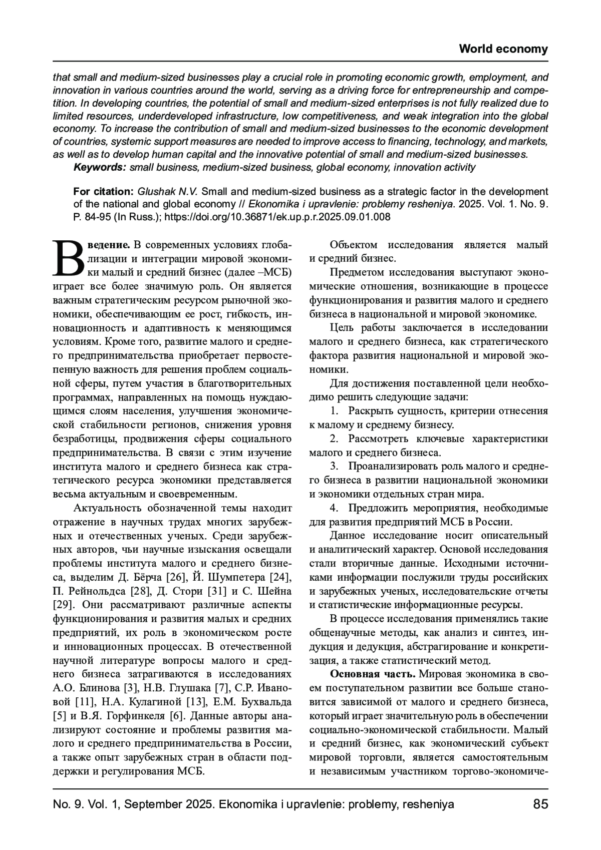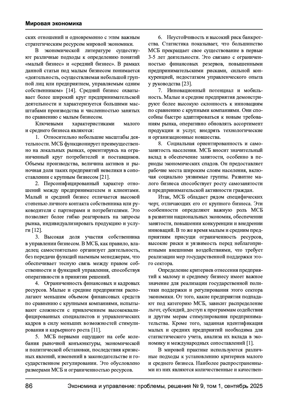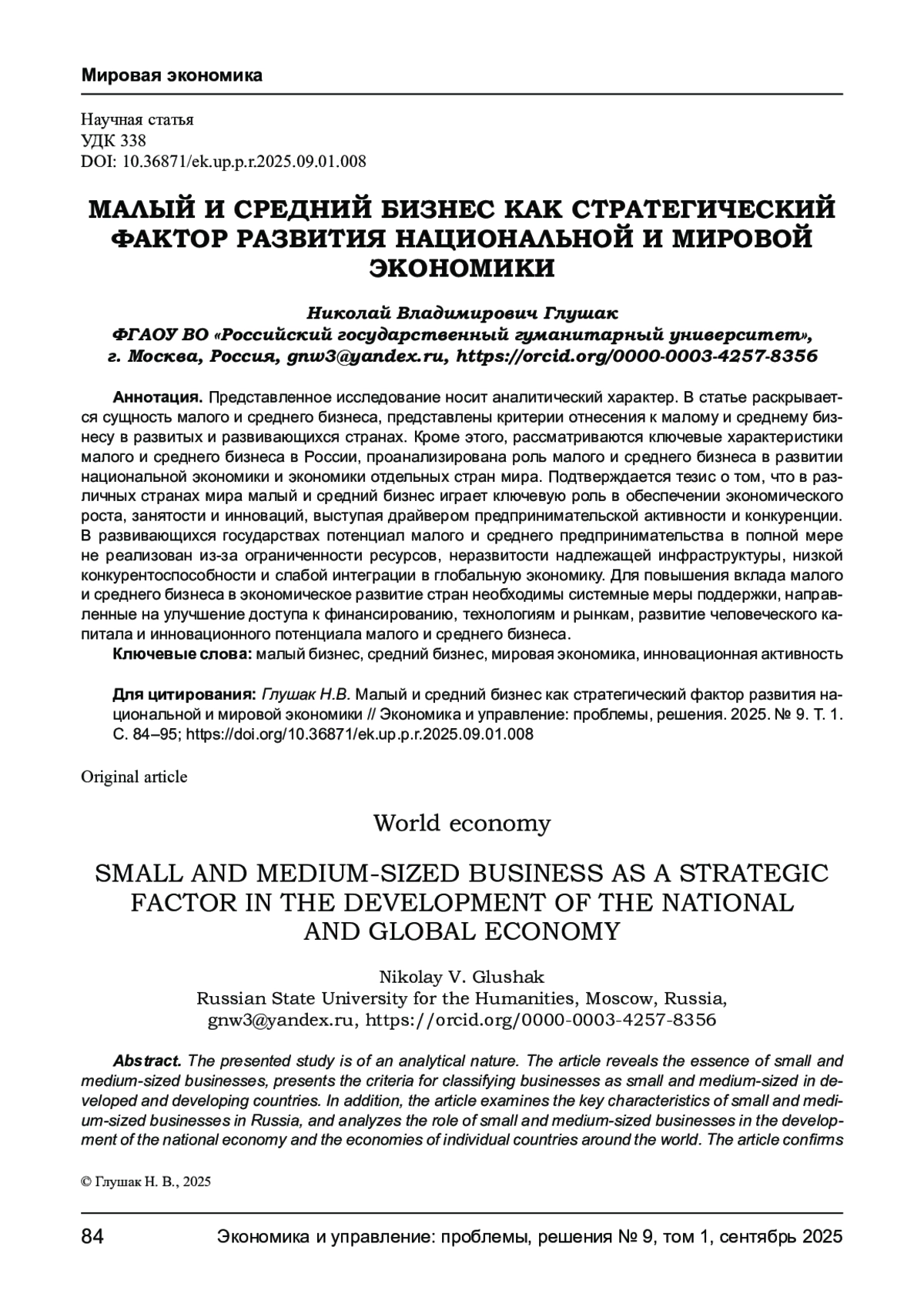 Представленное исследование носит аналитический характер. В статье раскрывается сущность малого и среднего бизнеса, представлены критерии отнесения к малому и среднему бизнесу в развитых и развивающихся странах. Кроме этого, рассматриваются ключевые характеристики малого и среднего бизнеса в России, проанализирована роль малого и среднего бизнеса в развитии национальной экономики и экономики отдельных стран мира. Подтверждается тезис о том, что в различных странах мира малый и средний бизнес играет ключевую роль в обеспечении экономического роста, занятости и инноваций, выступая драйвером предпринимательской активности и конкуренции. В развивающихся государствах потенциал малого и среднего предпринимательства в полной мере не реализован из-за ограниченности ресурсов, неразвитости надлежащей инфраструктуры, низкой конкурентоспособности и слабой интеграции в глобальную экономику. Для повышения вклада малого и среднего бизнеса в экономическое развитие стран необходимы системные меры поддержки, направленные на улучшение доступа к финансированию, технологиям и рынкам, развитие человеческого капитала и инновационного потенциала малого и среднего бизнеса.