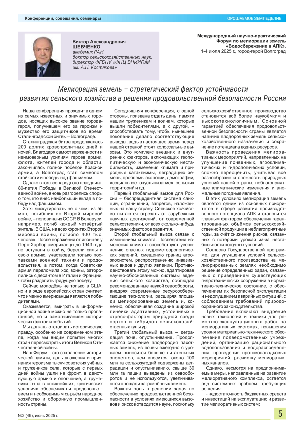 Основными негативными факторами, не позволяющими обеспечить высокую и устойчивую продуктивность мелиорированных земель, являются невысокий технический уровень и технико-эксплуатационное состояние оросительных систем, недостаточное применение комплексных агромелиоративных технологий при эксплуатации мелиорированных земель. Это приводит к нерациональному использованию водных ресурсов, развитию процессов деградации сельскохозяйственных земель, таких как эрозия, засоление, заболачивание, подтопление, потери органического вещества и элементов минерального питания, опустынивание. В связи с ростом дефицита водных ресурсов обеспечение населения и сельскохозяйственного производства качественной водой в достаточных количествах как одна из целей устойчивого развития включена в международный проект «Повестка дня в области устойчивого развития на период до 2030 года», принятый Генеральной Ассамблеей ООН 15.09.2025 г. Следовательно, направления научных исследований в области разработки и создания инновационной инженерной ирригационной инфраструктуры, адаптированной к природно-климатическим условиям агроландшафтов и эксплуатации мелиоративного природно-технологического комплекса для обеспечения рационального использования интегральных ресурсов и предотвращения развития негативных экологических процессов в мелиоративных агроландшафтах, являются важными с точки зрения общественных и государственных интересов. Материалы и методы. В качестве научно-методической базы использовались стандартные методы научных исследований: информационно-аналитические, статистические, патентные и экспериментальные, методы системного и математического анализа, экспертной оценки нормативных и научно-технических материалов, технологического и экологического мониторинга мелиоративных объектов, ретроспективный анализ научно-методических разработок в области мелиоративно-водохозяйственной и природоохранной деятельности. Результаты и обсуждение. В результате проведения мониторинговых исследований получены и представлены данные о текущем состоянии и развитии мелиоративного комплекса России к началу 2024 года. Выполнена экспертная оценка технико-экологического состояния мелиоративного комплекса и факторов, препятствующих рациональному и эколого-экономически сбалансированному использованию мелиоративной инфраструктуры, разработаны концепция и основные целевые индикаторы устойчивого развития мелиоративного комплекса России на долгосрочную перспективу – до 2040 года.