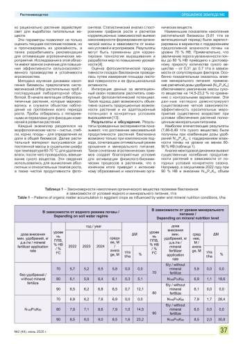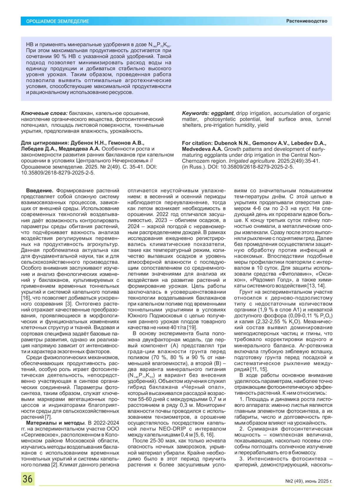 Изучены закономерности роста и формирования ранних баклажанов при использовании капельного орошения в южных районах Московской области. Эксперимент проводился по схеме с двумя переменными: первый фактор (А) отражал уровень увлажнения, второй фактор (В) – минеральное питание. В рамках полевых испытаний исследовалось влияние влажности грунта и внесения питательных веществ на вегетацию, формирование плодов и урожайность сорта «Черный опал», культивируемого под временными тоннельными укрытиями для получения ранней продукции. Анализировалась скорость наращивания органической массы как индикатор благоприятности агрономических условий. Отдельное внимание уделялось изучению фотосинтеза, который оценивался по следующим критериям: размеру листовой поверхности, фотосинтетической активности и продуктивности фотосинтеза. Пик развития листьев (27,4-32,8 тыс. м²/га) отмечался на 20-й день после начала плодоношения, а общий фотосинтетический потенциал за сезон колебался в пределах от 1580 до 2167 тыс. м²·дней/га. Повышение качества полива и питания положительно влияло на эти параметры. Полученные данные помогают не только контролировать состояние посадок, но и прогнозировать их продуктивность, а также совершенствовать агротехнические методы выращивания. Выявлена взаимосвязь между режимом орошения, применением минеральных удобрений и эффективностью фотосинтеза. Полученные результаты свидетельствуют о том, что для получения урожайности на уровне 40 т/га и выше необходимо поддерживать предполивную влажность почвы на уровне не ниже 80 % НВ и применять минеральные удобрения в дозе N P K. 140 70 50 При этом максимальная продуктивность достигается при сочетании 90 % НВ с указанной дозой удобрений. Такой подход позволяет минимизировать расход воды на единицу продукции и добиваться стабильно высокого уровня урожая. Таким образом, проведенная работа позволила выявить оптимальные агротехнические условия, способствующие максимальной продуктивности и рациональному использованию ресурсов.