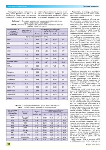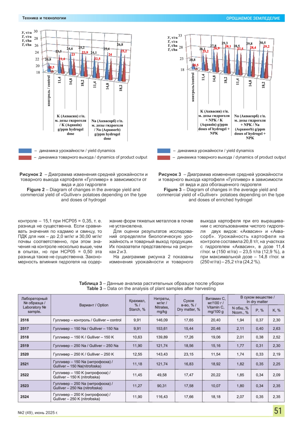Статья: РЕЗУЛЬТАТЫ ПРИМЕНЕНИЯ ГИДРОГЕЛЕЙ ПРИ ВОЗДЕЛЫВАНИИ КАРТОФЕЛЯ СОРТА «ГУЛЛИВЕР» НА ОРОШЕНИИ (2025)