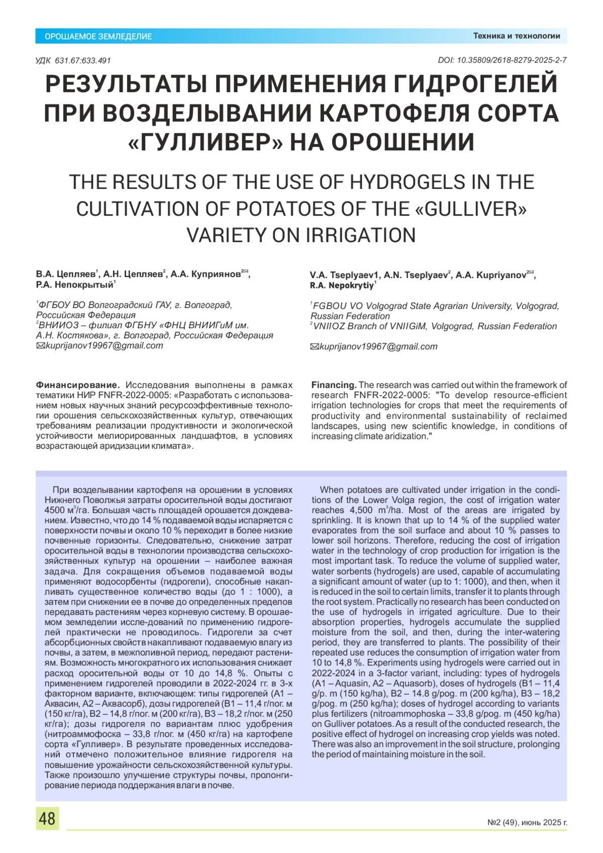 ЦЕПЛЯЕВ В. А., ЦЕПЛЯЕВ А. Н., КУПРИЯНОВ А. А., НЕПОКРЫТЫЙ Р. А. РЕЗУЛЬТАТЫ ПРИМЕНЕНИЯ ГИДРОГЕЛЕЙ ПРИ ВОЗДЕЛЫВАНИИ КАРТОФЕЛЯ СОРТА «ГУЛЛИВЕР» НА ОРОШЕНИИ // ОРОШАЕМОЕ ЗЕМЛЕДЕЛИЕ. 2025. № 2 (49)