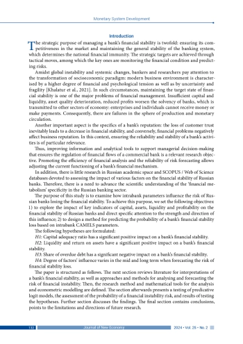 Amidst global instability and systemic changes, bankers and researchers pay attention to the transformation of socioeconomic paradigm: modern business environment is characterised by a higher degree of financial and psychological tension as well as by uncertainty and fragility [Khalatur et al., 2021]. In such circumstances, maintaining the target state of financial stability is one of the major problems of financial management. Insufficient capital and liquidity, asset quality deterioration, reduced profits worsen the solvency of banks, which is transmitted to other sectors of economy: enterprises and individuals cannot receive money or make payments. Consequently, there are failures in the sphere of production and monetary circulation