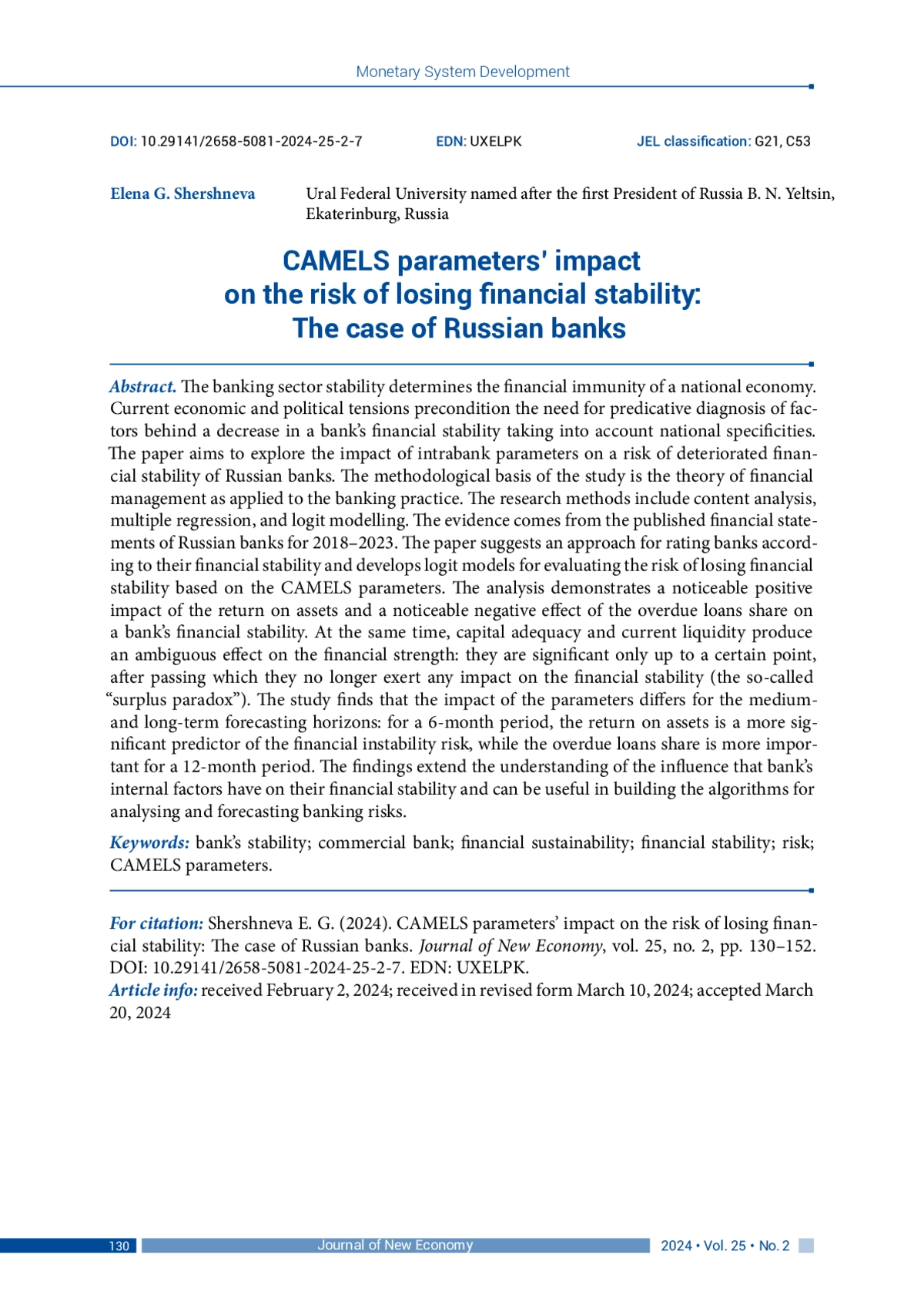 The banking sector stability determines the financial immunity of a national economy. Current economic and political tensions precondition the need for predicative diagnosis of factors behind a decrease in a bank’s financial stability taking into account national specificities. The paper aims to explore the impact of intrabank parameters on a risk of deteriorated financial stability of Russian banks. The methodological basis of the study is the theory of financial management as applied to the banking practice. The research methods include content analysis, multiple regression, and logit modelling. The evidence comes from the published financial statements of Russian banks for 2018–2023. The paper suggests an approach for rating banks according to their financial stability and develops logit models for evaluating the risk of losing financial stability based on the CAMELS parameters. The analysis demonstrates a noticeable positive impact of the return on assets and a noticeable negative effect of the overdue loans share on a bank’s financial stability. At the same time, capital adequacy and current liquidity produce an ambiguous effect on the financial strength: they are significant only up to a certain point, after passing which they no longer exert any impact on the financial stability (the so-called “surplus paradox”). The study finds that the impact of the parameters differs for the mediumand long-term forecasting horizons: for a 6-month period, the return on assets is a more significant predictor of the financial instability risk, while the overdue loans share is more important for a 12-month period. The findings extend the understanding of the influence that bank’s internal factors have on their financial stability and can be useful in building the algorithms for analysing and forecasting banking risks