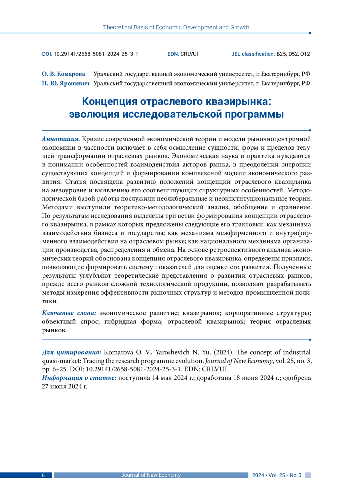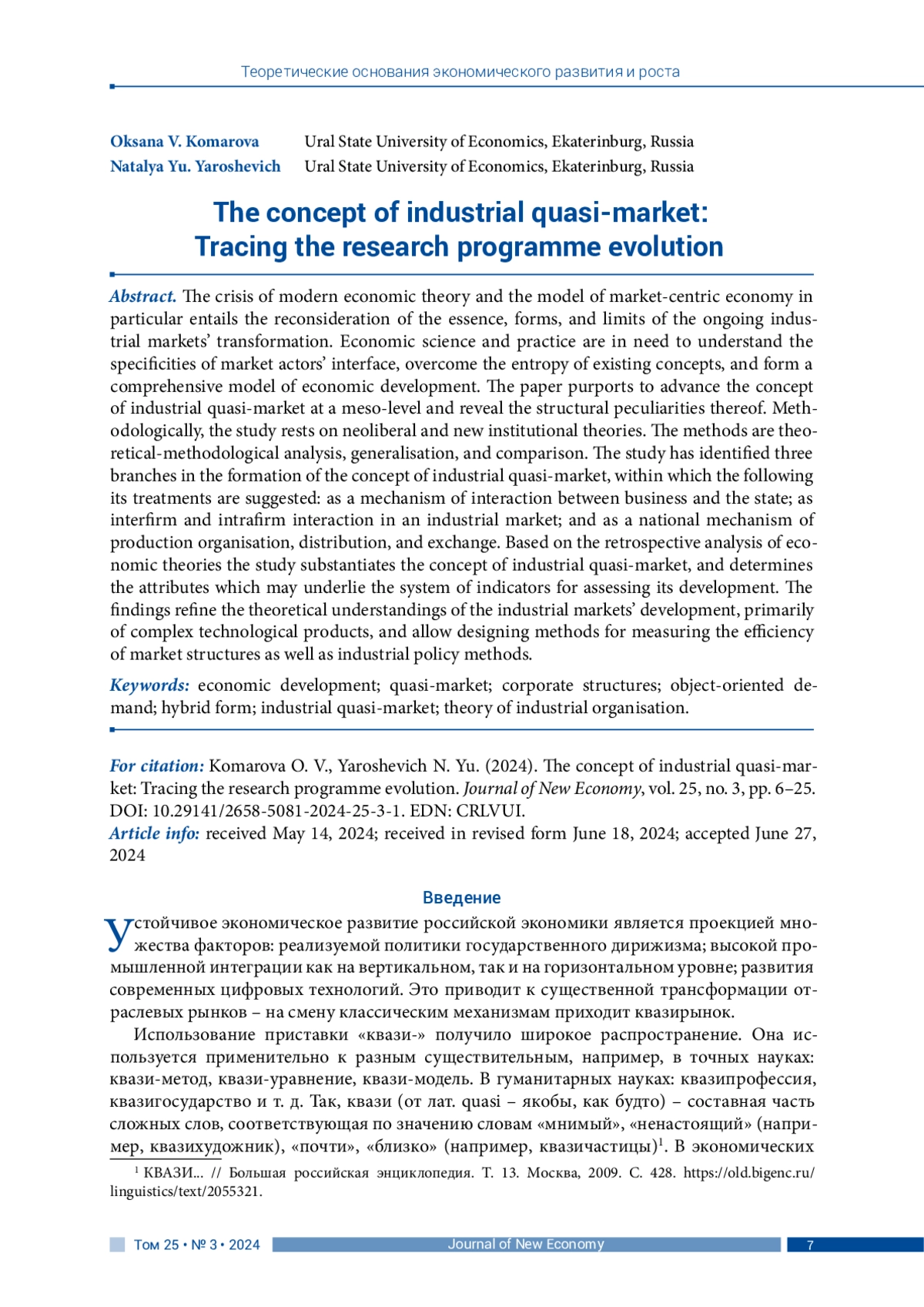 Кризис современной экономической теории и модели рыночноцентричной экономики в частности включает в себя осмысление сущности, форм и пределов текущей трансформации отраслевых рынков. Экономическая наука и практика нуждаются в понимании особенностей взаимодействия акторов рынка, в преодолении энтропии существующих концепций и формировании комплексной модели экономического развития. Статья посвящена развитию положений концепции отраслевого квазирынка на мезоуровне и выявлению его соответствующих структурных особенностей. Методологической базой работы послужили неолиберальные и неоинституциональные теории. Методами выступили теоретико-методологический анализ, обобщение и сравнение. По результатам исследования выделены три ветви формирования концепции отраслевого квазирынка, в рамках которых предложены следующие его трактовки: как механизма взаимодействия бизнеса и государства; как механизма межфирменного и внутрифирменного взаимодействия на отраслевом рынке; как национального механизма организации производства, распределения и обмена. На основе ретроспективного анализа экономических теорий обоснована концепция отраслевого квазирынка, определены признаки, позволяющие формировать систему показателей для оценки его развития. Полученные результаты углубляют теоретические представления о развитии отраслевых рынков, прежде всего рынков сложной технологической продукции, позволяют разрабатывать методы измерения эффективности рыночных структур и методов промышленной политики
