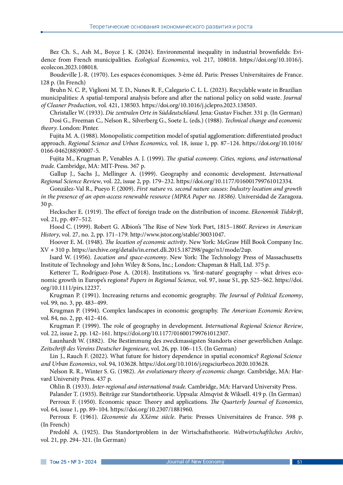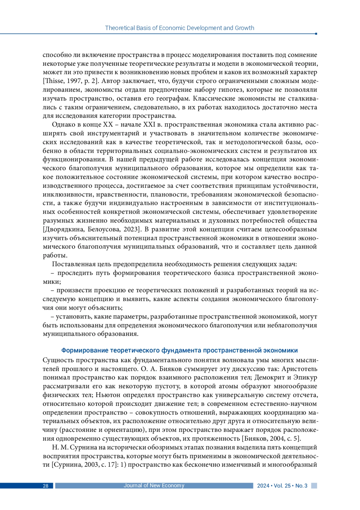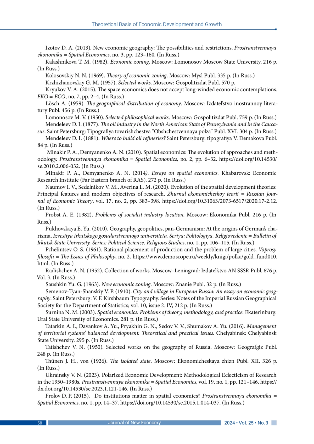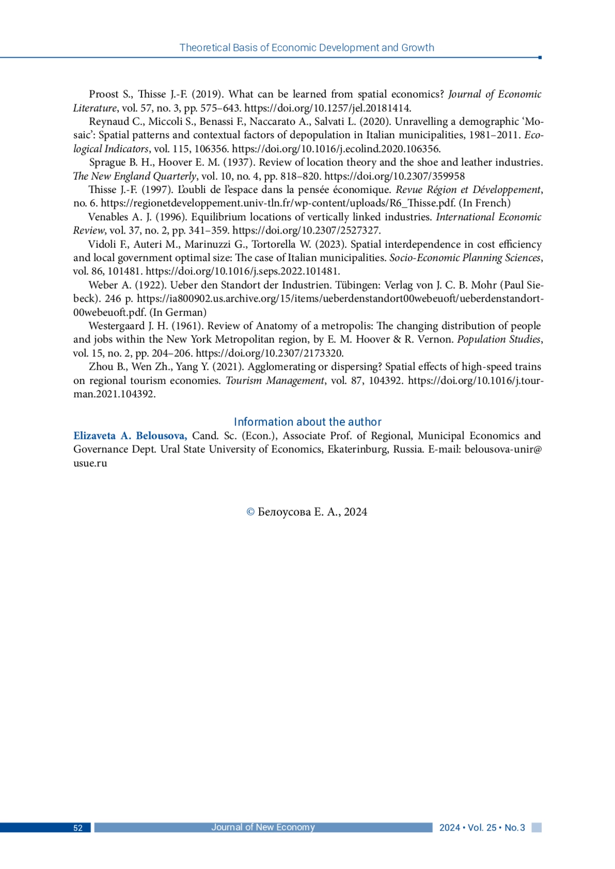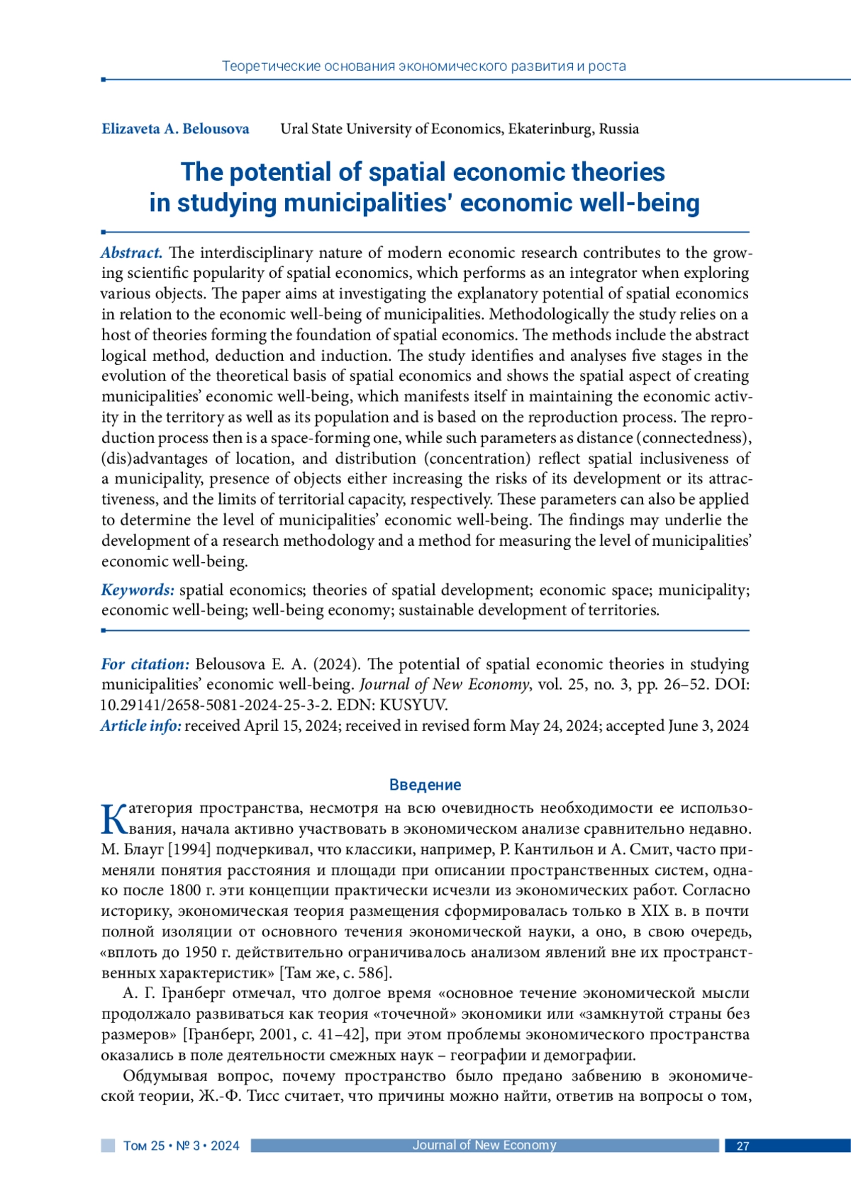 БЕЛОУСОВА Е. А. ПОТЕНЦИАЛ ТЕОРИИ ПРОСТРАНСТВЕННОЙ ЭКОНОМИКИ ДЛЯ ИССЛЕДОВАНИЯ ЭКОНОМИЧЕСКОГО БЛАГОПОЛУЧИЯ МУНИЦИПАЛЬНЫХ ОБРАЗОВАНИЙ // JOURNAL OF NEW ECONOMY. 2024. Т. 25 № 3