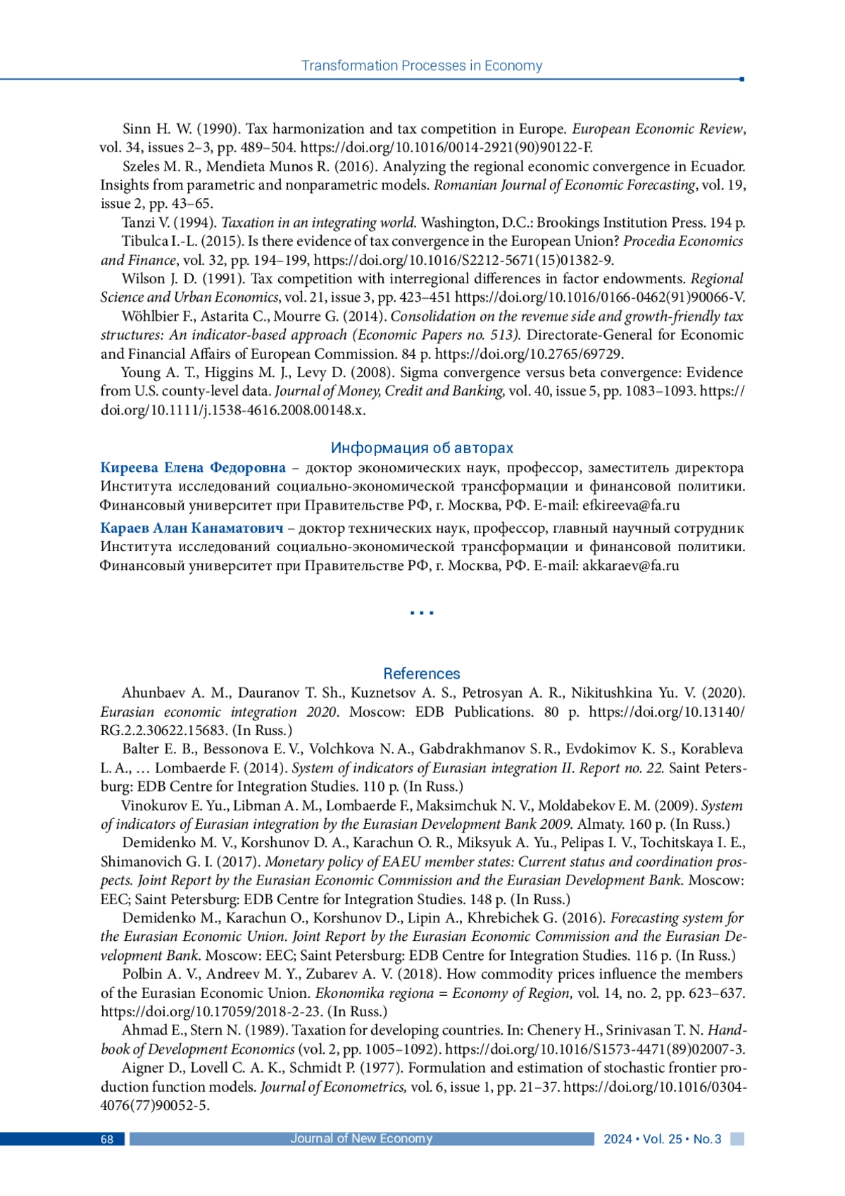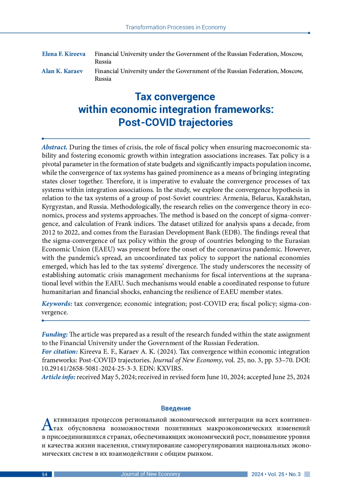 КИРЕЕВА Е. Ф., КАРАЕВ А. К. НАЛОГОВАЯ КОНВЕРГЕНЦИЯ В СИСТЕМЕ ЭКОНОМИЧЕСКОЙ ИНТЕГРАЦИИ: ТЕНДЕНЦИИ В ПОСТКОВИДНЫЙ ПЕРИОД // JOURNAL OF NEW ECONOMY. 2024. Т. 25 № 3