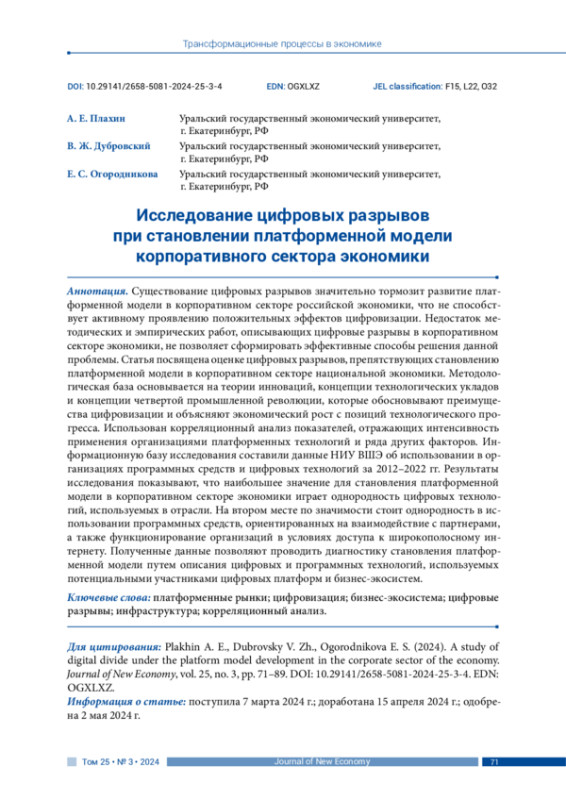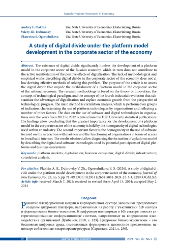 Существование цифровых разрывов значительно тормозит развитие платформенной модели в корпоративном секторе российской экономики, что не способствует активному проявлению положительных эффектов цифровизации. Недостаток методических и эмпирических работ, описывающих цифровые разрывы в корпоративном секторе экономики, не позволяет сформировать эффективные способы решения данной проблемы. Статья посвящена оценке цифровых разрывов, препятствующих становлению платформенной модели в корпоративном секторе национальной экономики. Методологическая база основывается на теории инноваций, концепции технологических укладов и концепции четвертой промышленной революции, которые обосновывают преимущества цифровизации и объясняют экономический рост с позиций технологического прогресса. Использован корреляционный анализ показателей, отражающих интенсивность применения организациями платформенных технологий и ряда других факторов. Информационную базу исследования составили данные НИУ ВШЭ об использовании в организациях программных средств и цифровых технологий за 2012–2022 гг. Результаты исследования показывают, что наибольшее значение для становления платформенной модели в корпоративном секторе экономики играет однородность цифровых технологий, используемых в отрасли. На втором месте по значимости стоит однородность в использовании программных средств, ориентированных на взаимодействие с партнерами, а также функционирование организаций в условиях доступа к широкополосному интернету. Полученные данные позволяют проводить диагностику становления платформенной модели путем описания цифровых и программных технологий, используемых потенциальными участниками цифровых платформ и бизнес-экосистем
