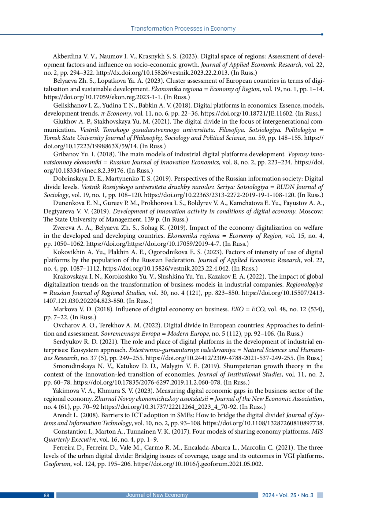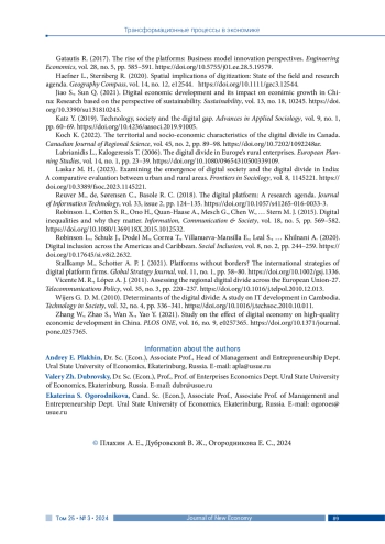 11. Коковихин А. Ю., Плахин А. Е., Огородникова Е. С. (2023). Факторы интенсивности использования цифровых платформ населением Российской Федерации // Journal of Applied Economic Research. Т. 22, № 4. С. 1087-1112. DOI: 10.15826/vestnik.2023.22.4.042 EDN: IWLAFI