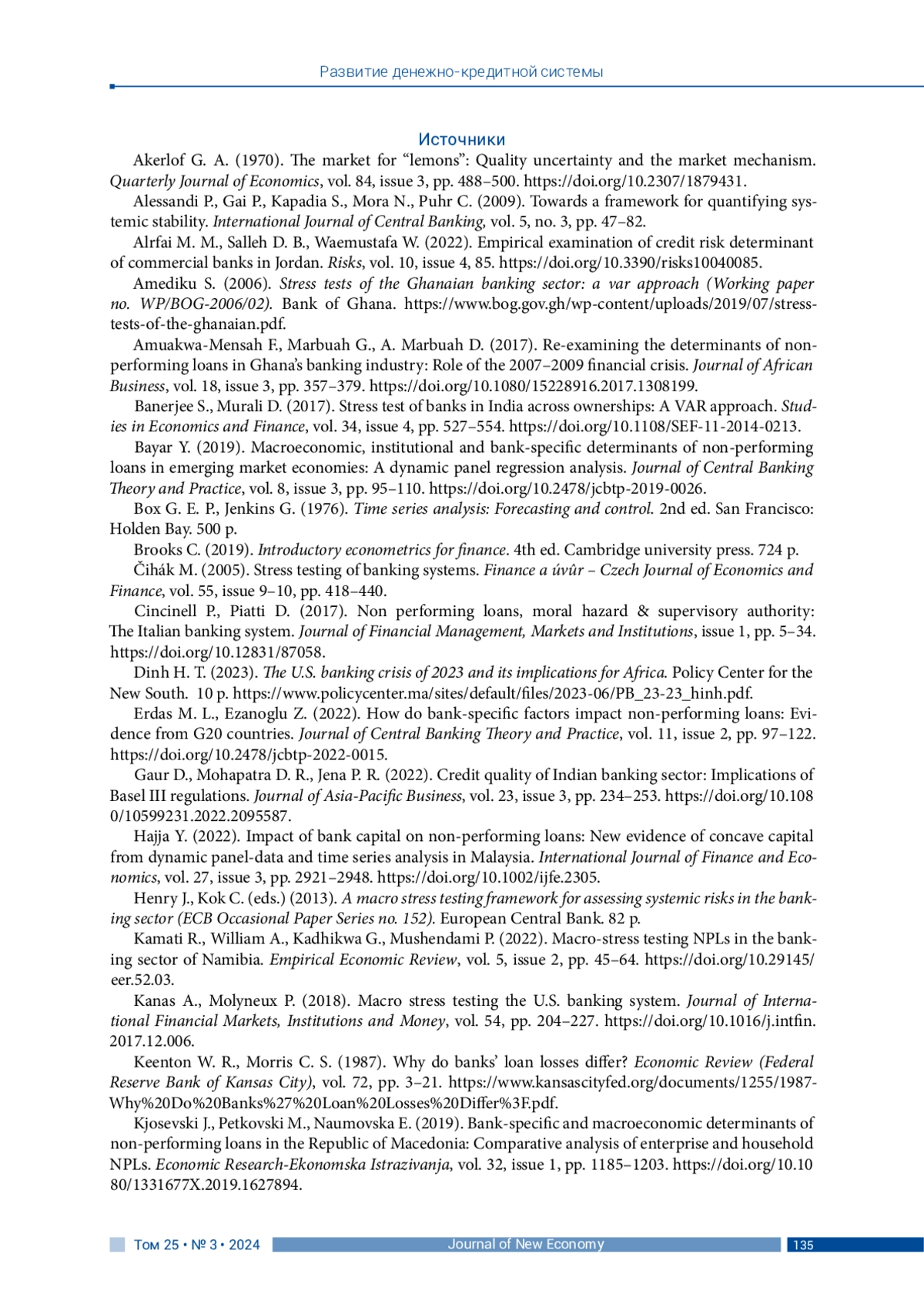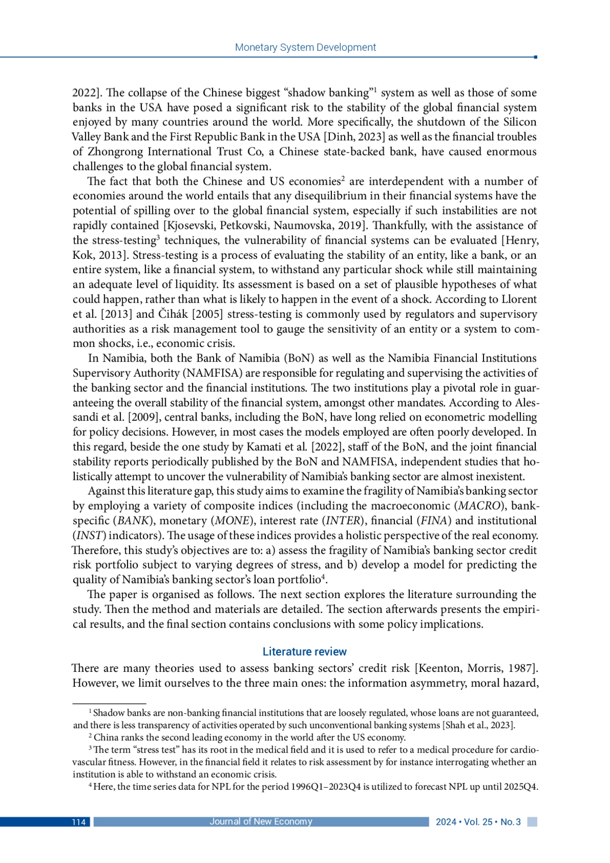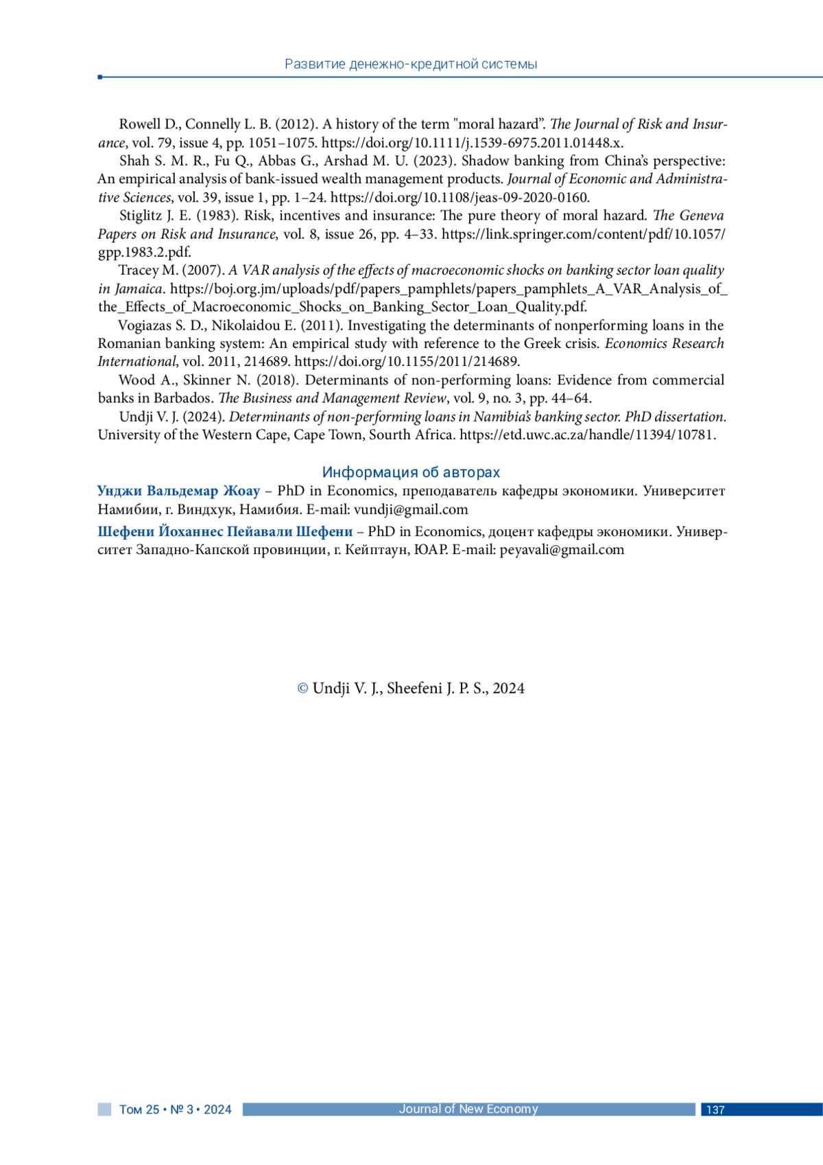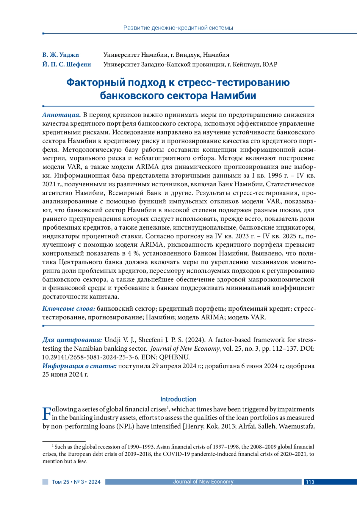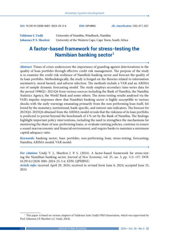 UNDJI V. J., SHEEFENI J. P. A FACTOR-BASED FRAMEWORK FOR STRESS-TESTING THE NAMIBIAN BANKING SECTOR // JOURNAL OF NEW ECONOMY. 2024. Т. 25 № 3