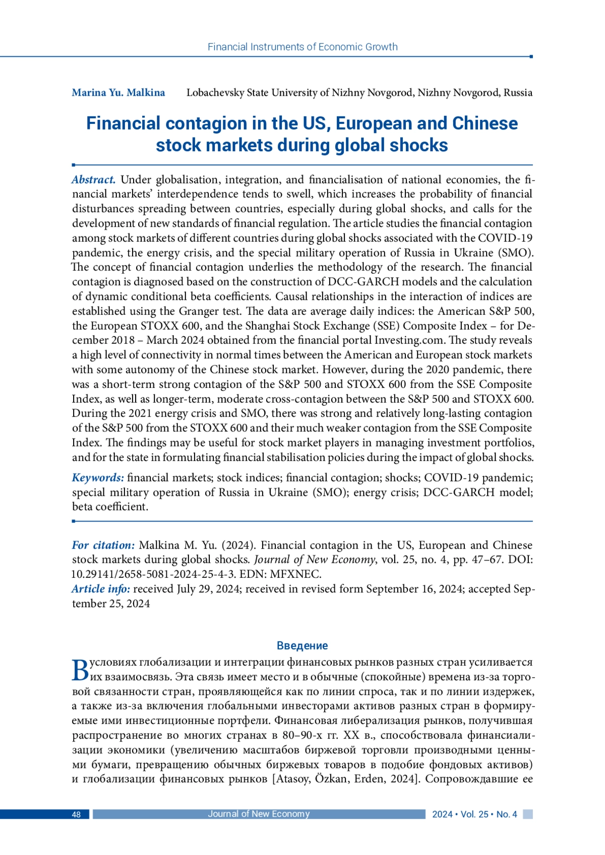 МАЛКИНА М. Ю. ФИНАНСОВОЕ ЗАРАЖЕНИЕ ФОНДОВЫХ РЫНКОВ США, ЕВРОПЫ И КИТАЯ ВО ВРЕМЯ ГЛОБАЛЬНЫХ ШОКОВ // JOURNAL OF NEW ECONOMY. 2024. Т. 25 № 4