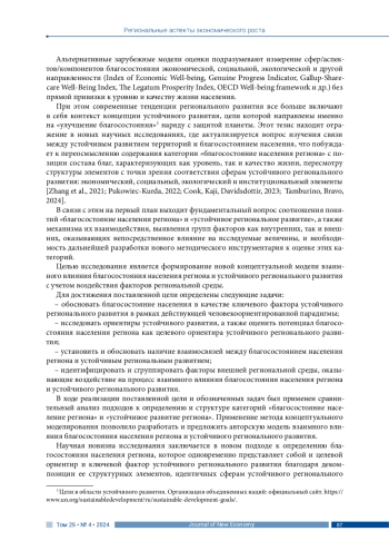 Актуальность исследования обусловлена дискуссионностью подходов к определению сущности и измерению уровня благосостояния населения региона. Особую значимость данной проблеме придает контекст концепции устойчивого развития, ориентированной на рост благосостояния и сохранение экологического баланса. Статья направлена на формирование новой теоретической модели, характеризующей взаимное влияние устойчивого регионального развития и благосостояния населения региона. Методологическую основу составили фундаментальные положения концепции устойчивого развития, теорий благосостояния, регионального и пространственного развития. Использовались методы сравнительного анализа, синтеза, концептуального моделирования. В результате установлено, что благосостояние населения региона выступает одновременно как в роли целевого ориентира ввиду наличия в своей структуре элементов идентичных сферам устойчивого развития, так и в роли ключевого фактора устойчивого регионального развития благодаря набору материальных и нематериальных, экономических и неэкономических благ, образующих экономический, социальный, экологический и институциональный элементы, обеспечивая непрерывный процесс изменений в региональной социо-эколого-экономической системе под воздействием межрегиональных, национальных и международных факторов внешней региональной среды. Представленная в статье концептуальная модель расширяет представление о процессе обеспечения устойчивого регионального развития, вносит вклад в теорию благосостояния и формирует основу для разработки методического инструментария оценки благосостояния населения региона
