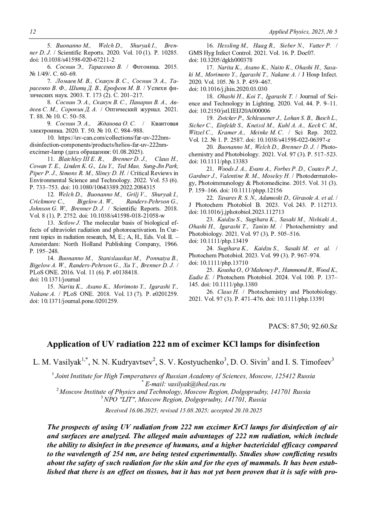 Выполнен анализ перспективности применения УФ-излучения 222 нм эксимерных KrCl-ламп для обеззараживания воздуха и поверхностей. Предполагаемые основные преимущества излучения 222 нм, заключающиеся в возможности проводить обеззараживание в присутствии людей, и более высокая бактерицидная эффективность по сравнению с длиной волны 254 нм ртутных и амальгамных ламп низкого давления, проходят экспериментальную проверку. Исследования показывают противоречивые результаты о безопасности такого излучения для кожи и для глаз млекопитающих. Инактивация вирусов и простых бактериологических штаммов УФ-излучением 222 нм и 254 нм достигается при аналогичных УФ-дозах, однако для более крупных объектов (эндоспоры, грибы, гифы грибов) существенное преимущество имеет УФ-излучение 254 нм. Эффективность генерации УФ-излучения 222 нм в промышленных KrCl-лампах составляет 3–5 %, что существенно меньше, чем для ртутных и амаль-гамных ламп низкого давления 30–35 %.