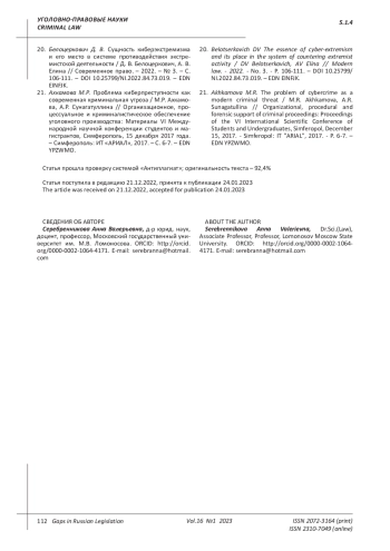 Extremism and terrorism in cyberspace: threats to the peace and security of mankind: Collection of articles on the results of the III All-Russian student scientific and practical part-time video conference, Barnaul, November 26, 2020. - Barnaul: Altai State University, 2020. - 203 p. ISBN: 978-5-7904-2523-3 EDN: SLUDBI