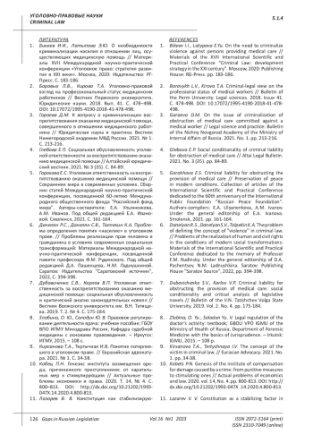 5. Горохова Е.С. Уголовная ответственность за воспрепятствованию оказанию медицинской помощи // Сохранение мира в современных условиях. Сборник статей Международной научно-практической конференции, посвященной 60-летию Международного общественного фонда “Российский фонд мира”. Авторы-составители: Е.А. Ульяненкова, А.М. Иванов. Под общей редакцией Е.А. Ивановой. Смоленск, 2021. С. 161-164. EDN: IUVSWB