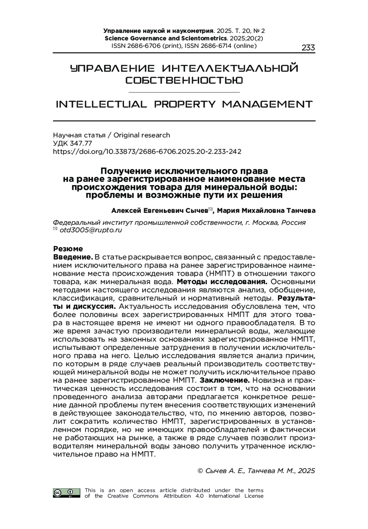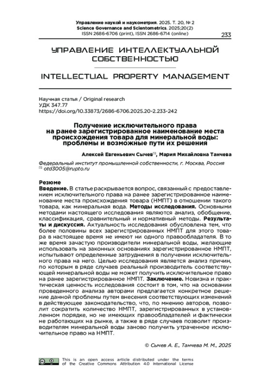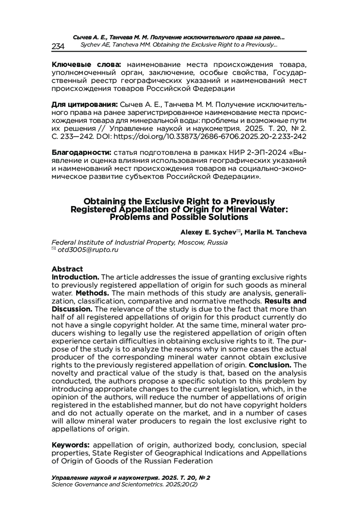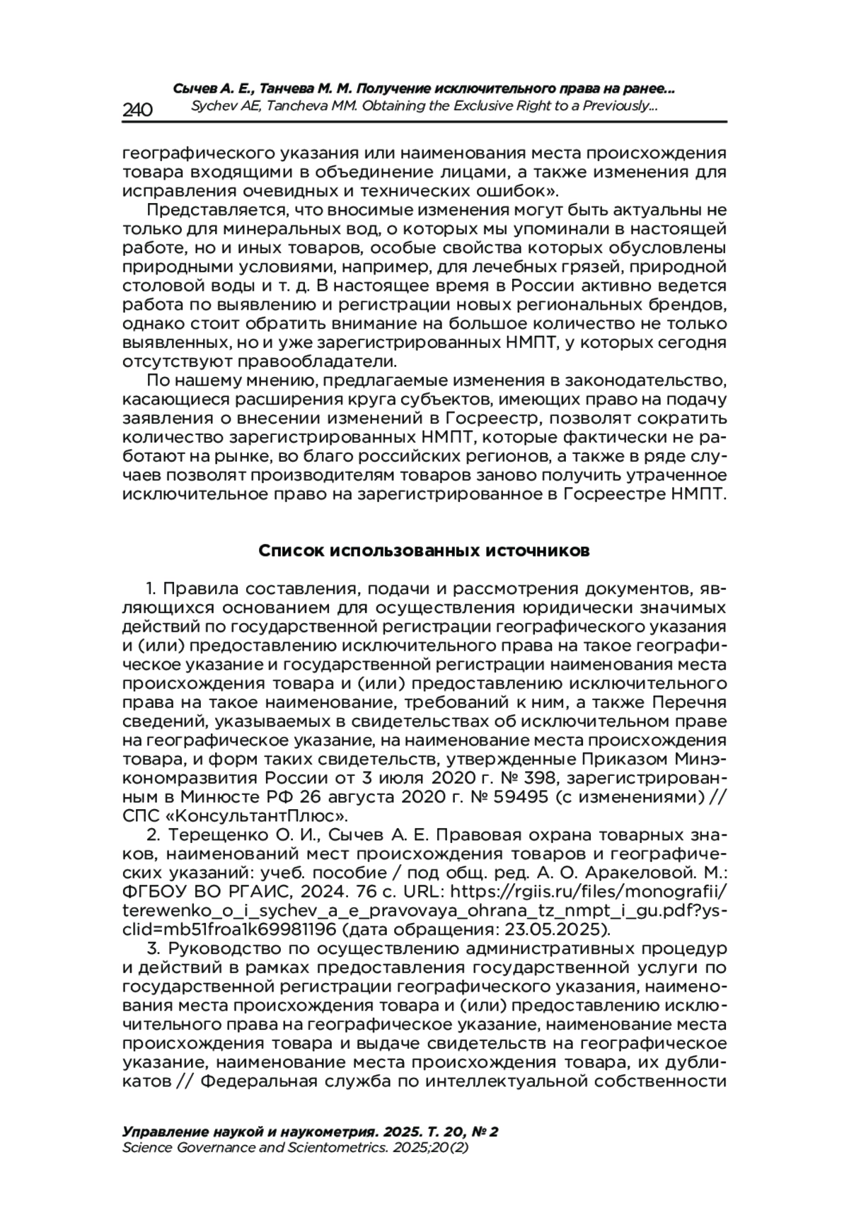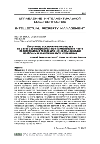 СЫЧЕВ А. Е., ТАНЧЕВА М. М. ПОЛУЧЕНИЕ ИСКЛЮЧИТЕЛЬНОГО ПРАВА НА РАНЕЕ ЗАРЕГИСТРИРОВАННОЕ НАИМЕНОВАНИЕ МЕСТА ПРОИСХОЖДЕНИЯ ТОВАРА ДЛЯ МИНЕРАЛЬНОЙ ВОДЫ: ПРОБЛЕМЫ И ВОЗМОЖНЫЕ ПУТИ ИХ РЕШЕНИЯ // УПРАВЛЕНИЕ НАУКОЙ И НАУКОМЕТРИЯ. 2025. Т. 20 № 2