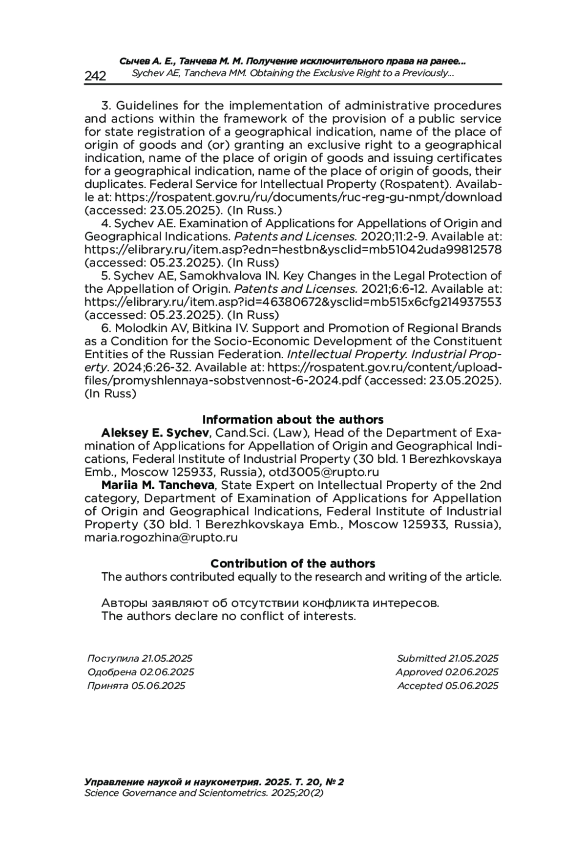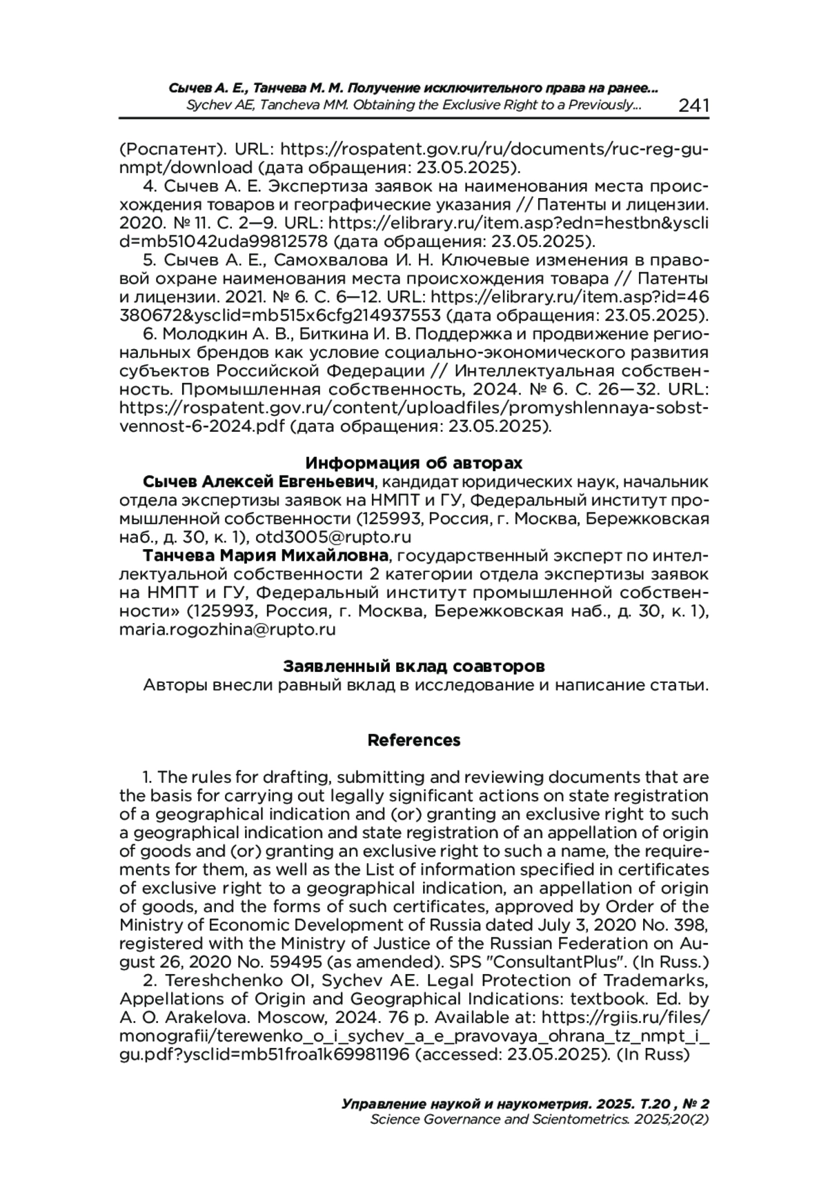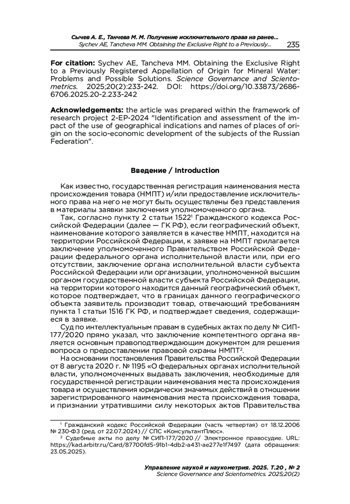 СЫЧЕВ А. Е., ТАНЧЕВА М. М. ПОЛУЧЕНИЕ ИСКЛЮЧИТЕЛЬНОГО ПРАВА НА РАНЕЕ ЗАРЕГИСТРИРОВАННОЕ НАИМЕНОВАНИЕ МЕСТА ПРОИСХОЖДЕНИЯ ТОВАРА ДЛЯ МИНЕРАЛЬНОЙ ВОДЫ: ПРОБЛЕМЫ И ВОЗМОЖНЫЕ ПУТИ ИХ РЕШЕНИЯ // УПРАВЛЕНИЕ НАУКОЙ И НАУКОМЕТРИЯ. 2025. Т. 20 № 2