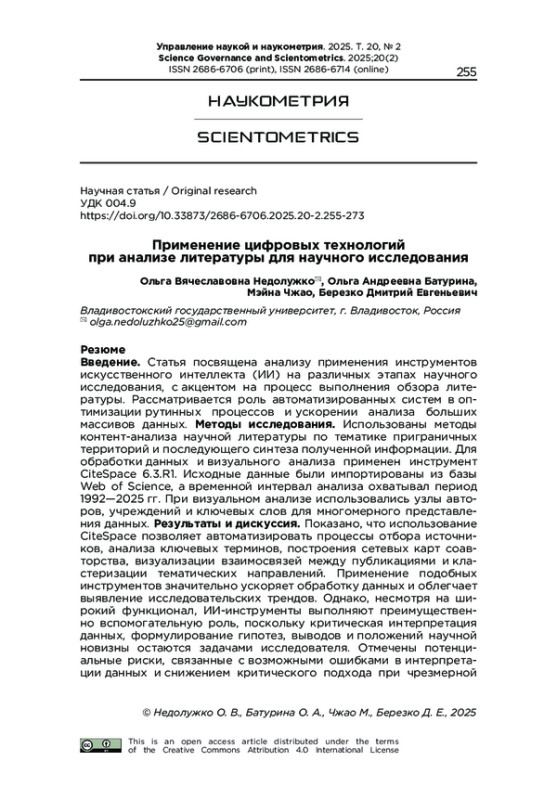 Результаты и дискуссия. Показано, что использование CiteSpace позволяет автоматизировать процессы отбора источников, анализа ключевых терминов, построения сетевых карт соавторства, визуализации взаимосвязей между публикациями и кластеризации тематических направлений. Применение подобных инструментов значительно ускоряет обработку данных и облегчает выявление исследовательских трендов. Однако, несмотря на широкий функционал, ИИ-инструменты выполняют преимущественно вспомогательную роль, поскольку критическая интерпретация данных, формулирование гипотез, выводов и положений научной новизны остаются задачами исследователя. Отмечены потенциальные риски, связанные с возможными ошибками в интерпретации данных и снижением критического подхода при чрезмерной зависимости от автоматизированных систем.