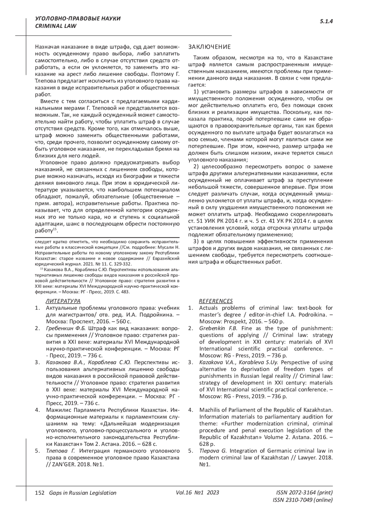 МУСАЛИ Н. ШТРАФ КАК ВИД УГОЛОВНОГО НАКАЗАНИЯ В РЕСПУБЛИКЕ КАЗАХСТАН // ПРОБЕЛЫ В РОССИЙСКОМ ЗАКОНОДАТЕЛЬСТВЕ. 2023. Т. 16 № 1