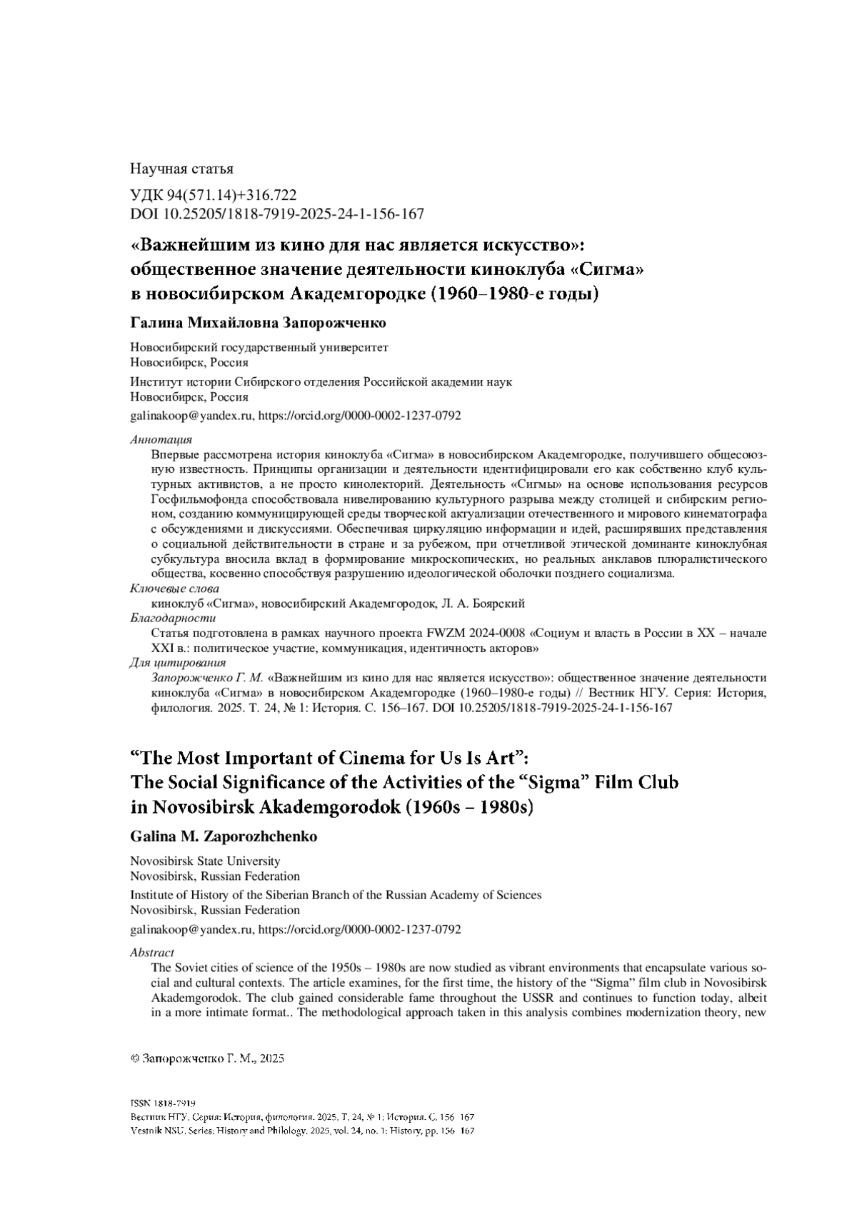 ЗАПОРОЖЧЕНКО Г. М. «ВАЖНЕЙШИМ ИЗ КИНО ДЛЯ НАС ЯВЛЯЕТСЯ ИСКУССТВО»: ОБЩЕСТВЕННОЕ ЗНАЧЕНИЕ ДЕЯТЕЛЬНОСТИ КИНОКЛУБА «СИГМА» В НОВОСИБИРСКОМ АКАДЕМГОРОДКЕ (1960–1980-Е ГОДЫ) // ВЕСТНИК НГУ. СЕРИЯ: ИСТОРИЯ, ФИЛОЛОГИЯ. 2025. ТОМ 24, № 1