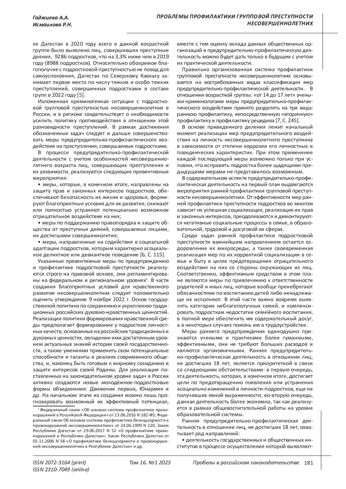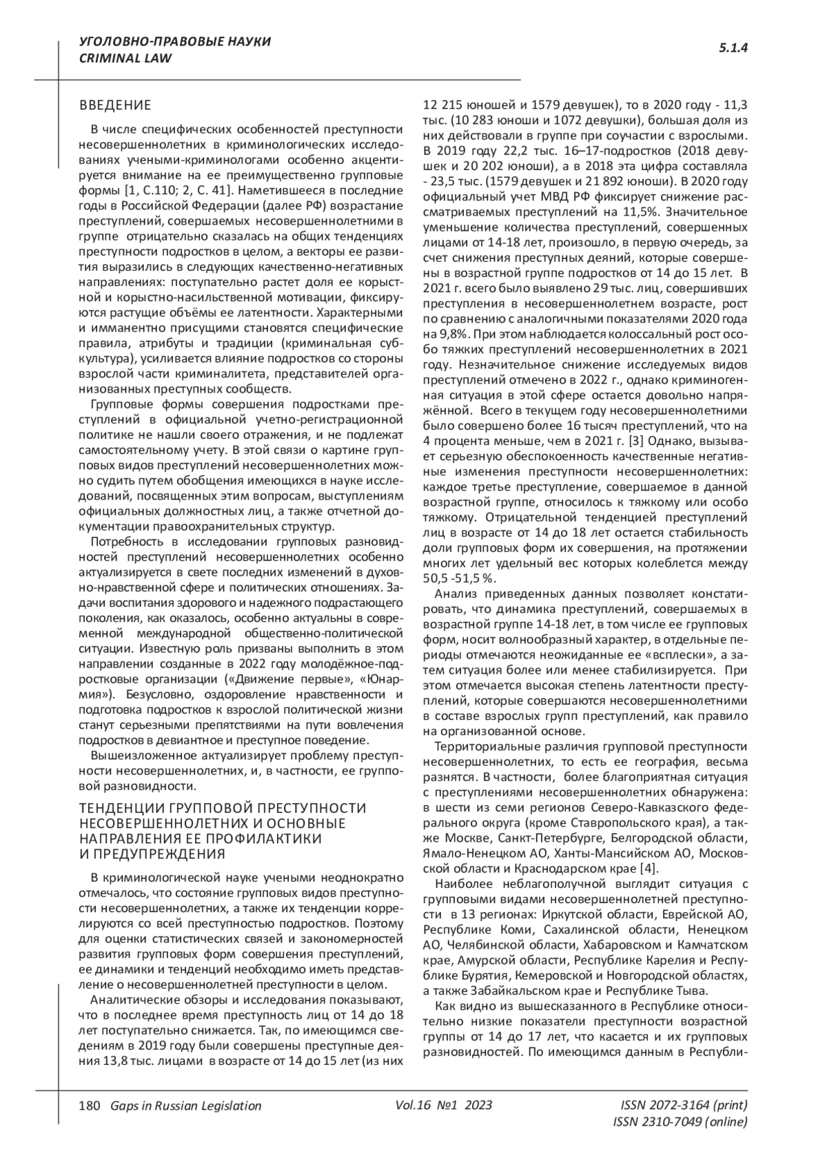 В предлагаемой читателю статье исследованы вопросы групповой преступности несовершеннолетних и проблемы предупредительно-профилактического воздействия на указанную разновидность преступности. В работе предпринята попытка вскрыть динамику и тенденции развития преступлений, совершаемых подростками в автономных и смешанных группах. Авторами отмечены сложности в определении тенденций развития групповой преступности и отсутствии самостоятельного учета групповых видов преступности подростков. Характеристика динамики рассматриваемого вида преступности основана сравнительном анализе данных о преступности несовершеннолетних в целом и приводимых данных об этой разновидности преступлений в отчетных данных правоохранительных структур и выступлениях официальных должностных лиц. Авторы констатируют возрастание опасности групповых форм совершения преступлений подростками и констатируют потребность в принятии масштабных мер противодействия им. Авторами рассмотрены основные направления предупредительно-профилактической деятельности в отношении групповых видов преступлений несовершеннолетних, оценена их эффективность и прогнозируемый ее потенциал при условии их активизации в дальнейшем. Отдавая предпочтение мерам ранней предупредительно-профилактической деятельности авторами, подчеркивается необходимость консолидации общественных и государственных структур в этом направлении.
