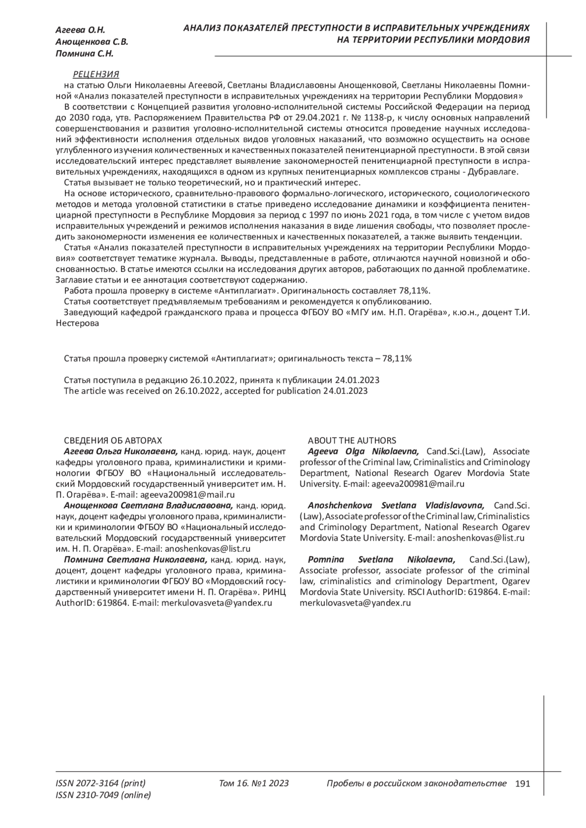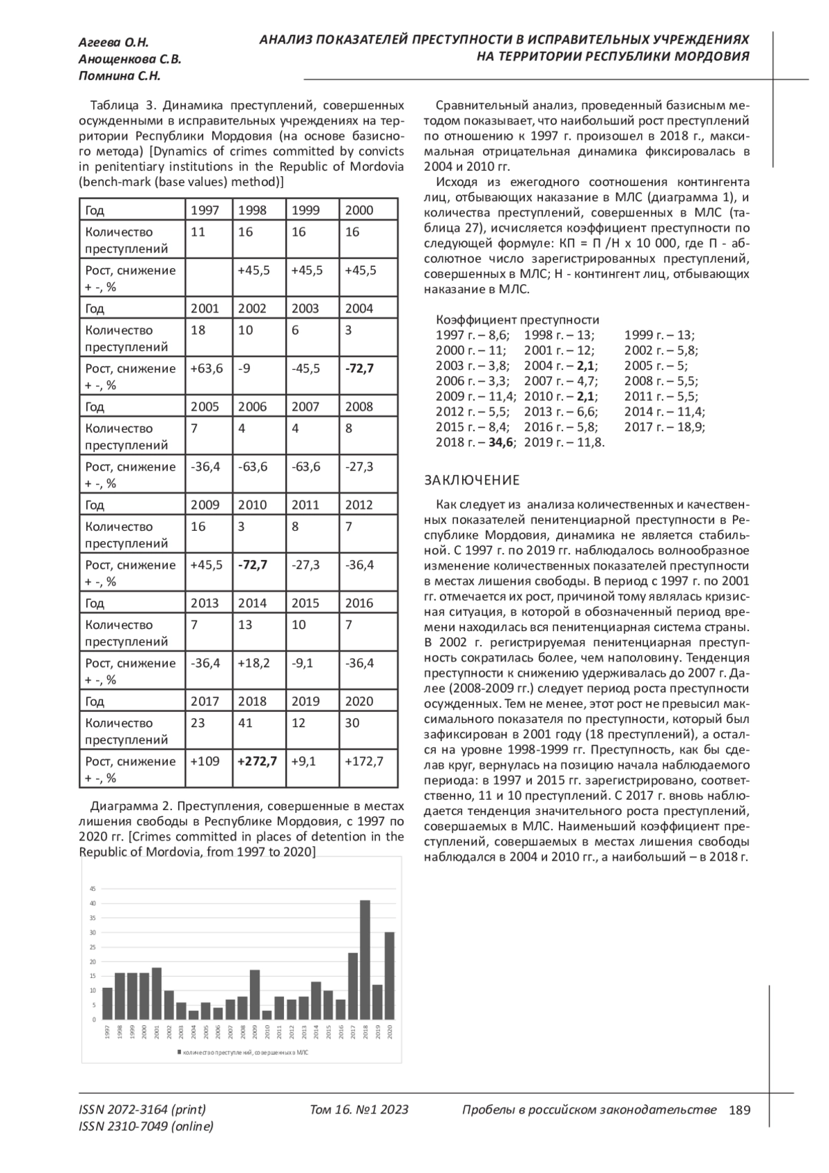 В продолжение идей, отраженных в статьях «Иссле - дование пенитенциарной преступности в Республике Мордовия: введение в проблему» и «Структура пре - ступности в исправительных учреждениях на терри - тории Республики Мордовия», используя положения, выработанные в указанных публикациях, учитываем следующие положения. Масштабы пенитенциарной преступности не отли - чаются критическими цифрами, но ее общественная опасность более чем очевидна: преступления совер - шаются лицами, уже осужденными к лишению свобо - ды за ранее совершенные преступления, как правило, относящиеся к тяжким и особо тяжким. Совершение преступлений в условиях контроля со стороны адми - нистрации ФСИН умаляет авторитет этого ведомства.
