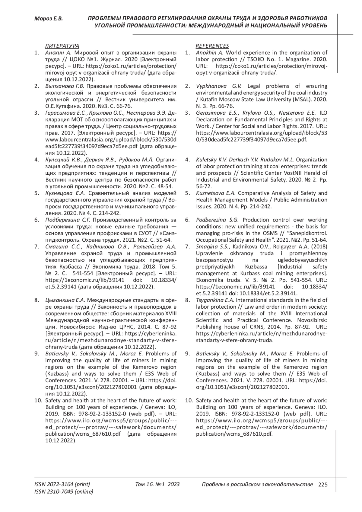 7. Смагина С.С., Кадникова О.В., Рольгайзер А.А. Управление охраной труда и промышленной безопасностью на угледобывающих предприятиях Кузбасса // Экономика труда. 2018. Том 5. № 2. С. 541-554 [Электронный ресурс]. - URL: https://1economic.ru/lib/39141 10.18334/et.5.2.39141 (дата обращения 10.12.2022). DOI: 10.18334/et.5.2.39141( EDN: XUGKHR