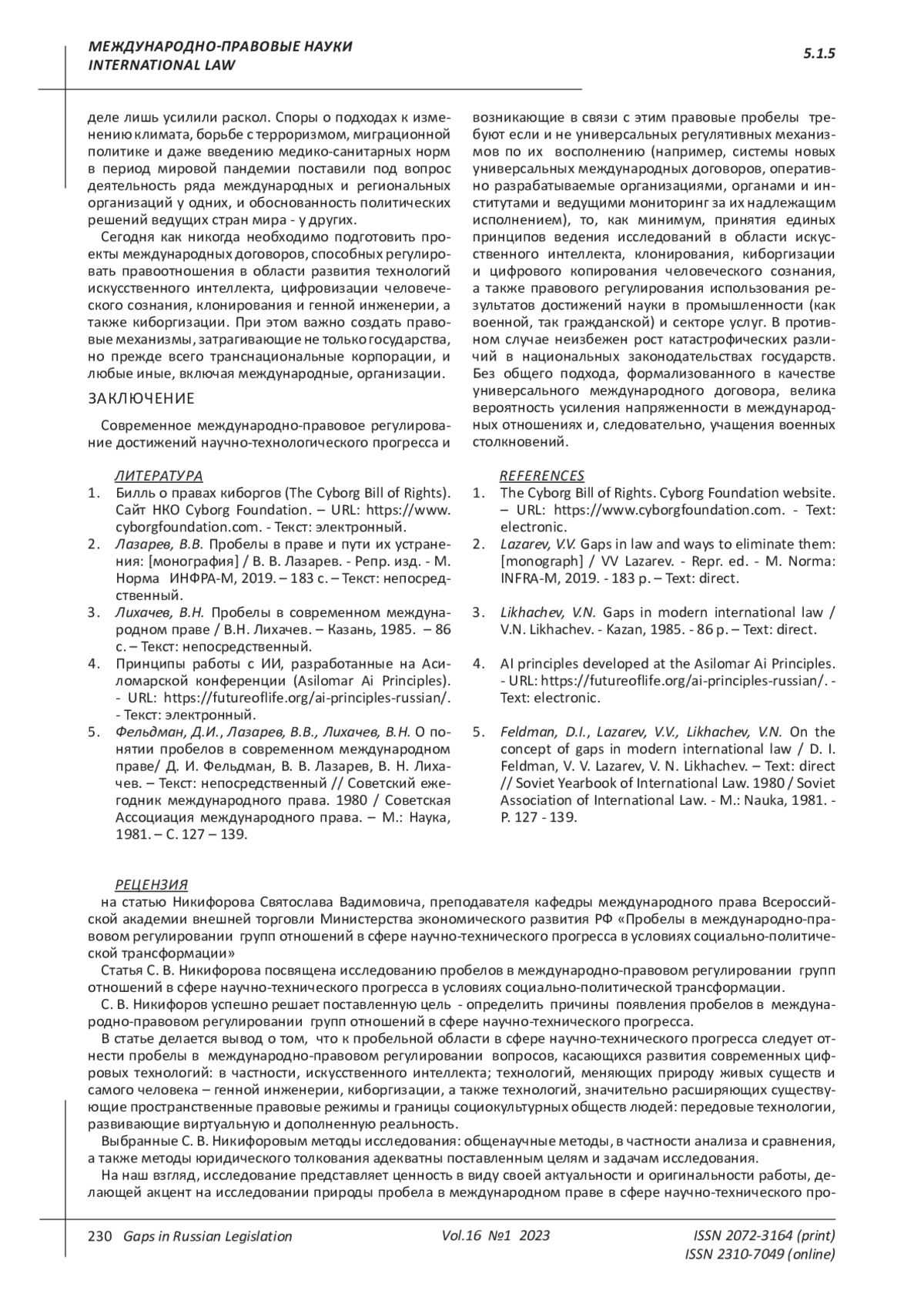 Feldman, D.I., Lazarev, V.V., Likhachev, V.N. On the concept of gaps in modern international law / D. I. Feldman, V. V. Lazarev, V. N. Likhachev. - Text: direct // Soviet Yearbook of International Law. 1980 / Soviet Association of International Law. - M.: Nauka, 1981. - P. 127 - 139.