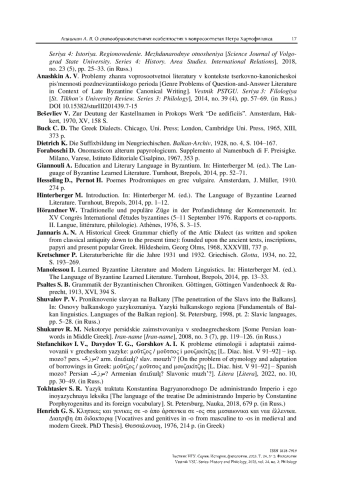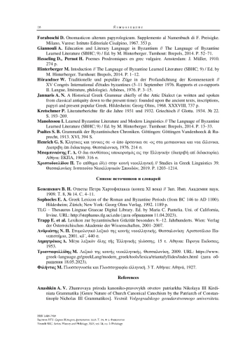 17. Manolessou I. Learned Byzantine Literature and Modern Linguistics // The Language of Byzantine Learned Literature (SBHC; 9) / Ed. by M. Hinterberger. Turnhout: Brepols, 2014. P. 13-33.