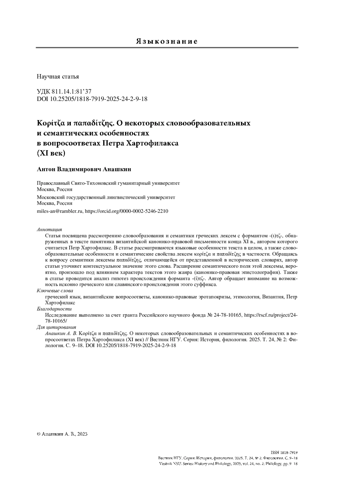 Статья посвящена рассмотрению словообразования и семантики греческих лексем с формантом -(ι)τζ-, обнаруженных в тексте памятника византийской канонико-правовой письменности конца XI в., автором которого считается Петр Хартофилакс. В статье рассматриваются языковые особенности текста в целом, а также словообразовательные особенности и семантические свойства лексем κορίτζα и παπαδίτζης в частности. Обращаясь к вопросу семантики лексемы παπαδίτζης, отличающейся от представленной в исторических словарях, автор статьи уточняет контекстуальное значение этого слова. Расширение семантического поля этой лексемы, вероятно, произошло под влиянием характера текстов этого жанра (канонико-правовая эпистолография). Также в статье проводится анализ гипотез происхождения форманта -(ί)τζ-. Автор обращает внимание на возможность исконно греческого или славянского происхождения этого суффикса.