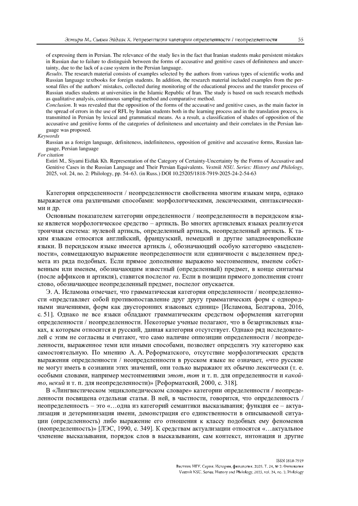 Цель данного исследования заключается в сопоставлении способов выражения категории определенности / неопределенности в русском и персидском языках. Материалом для исследования послужили примеры, отобранные методом сплошной выборки из различного рода исследовательских работ, учебников русского языка для студентов-иностранцев, личной картотеки ошибок, собранной авторами при контроле учебного процесса и практики перевода студентов-русистов высших учебных заведений Ирана. Исследование построено на основе качественного анализа и сравнительно-сопоставительного метода. В результате уточнена классификация признаков, лежащих в основе оппозиции форм винительного и родительного падежей как средств выражения определенности и неопределенности в русском языке, и исчислены их корреляты в персидском языке.