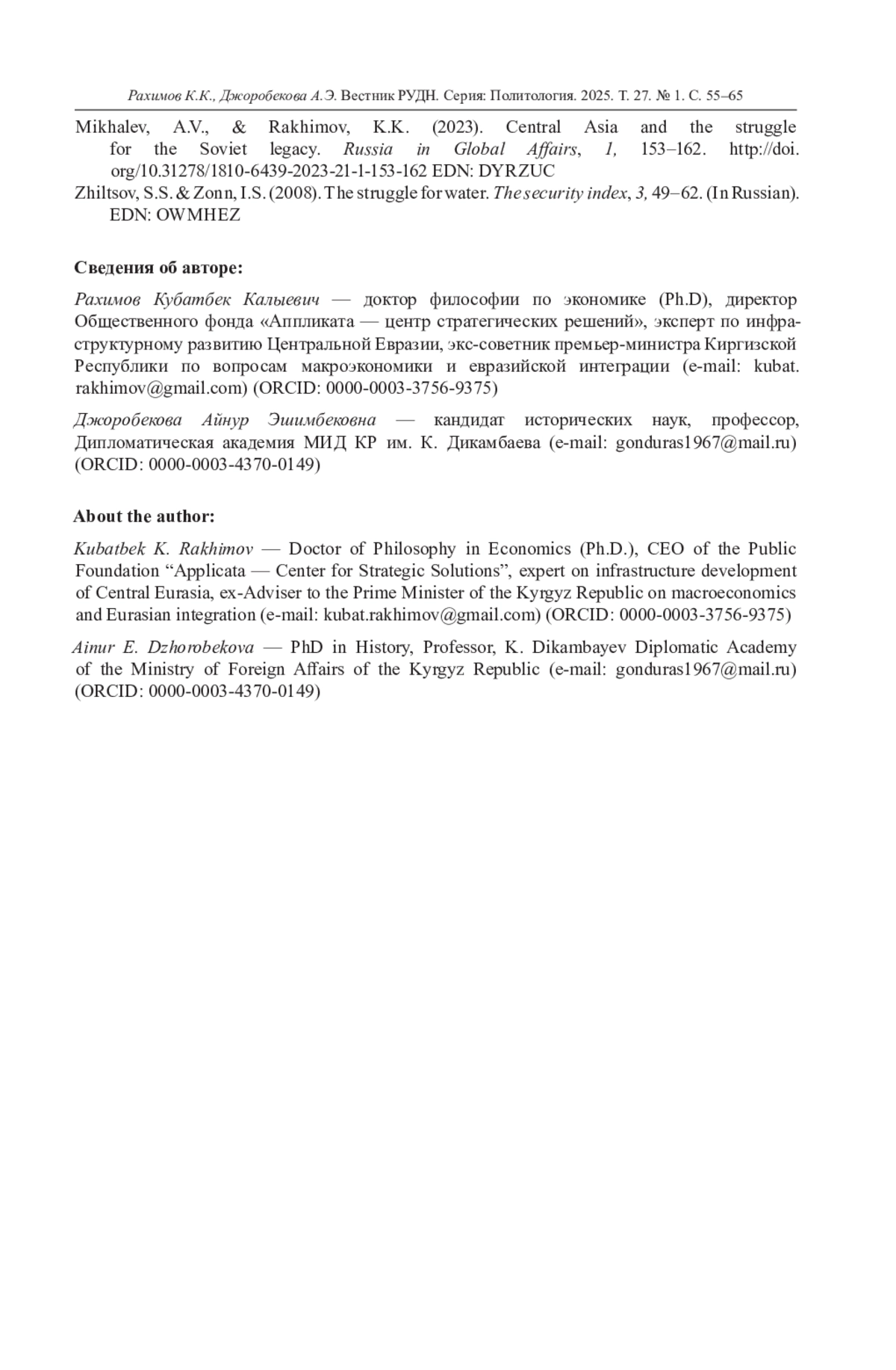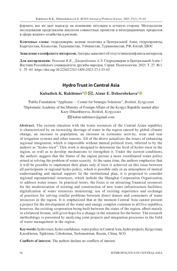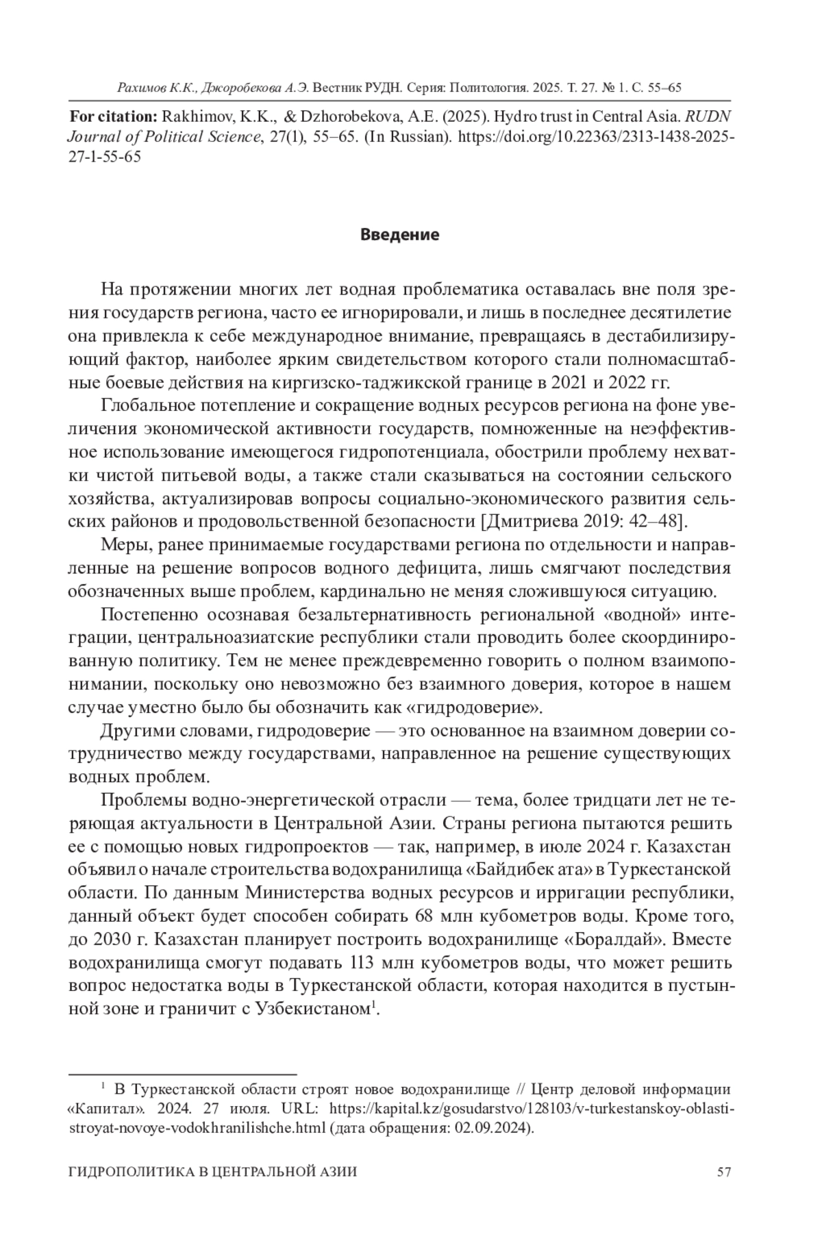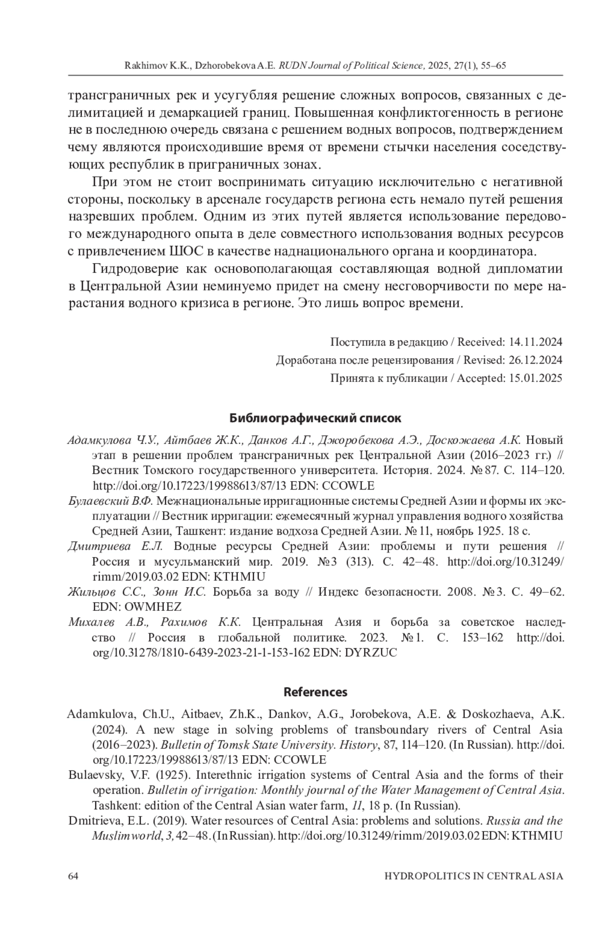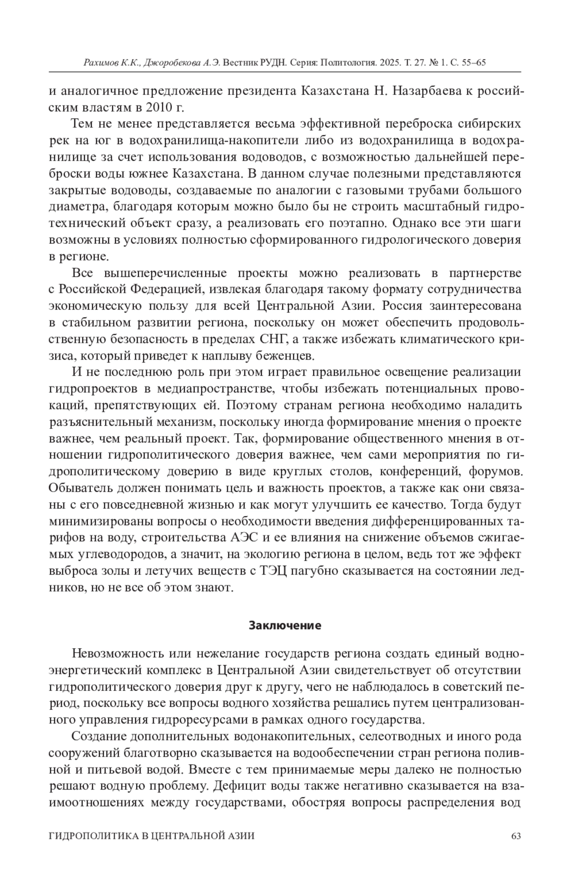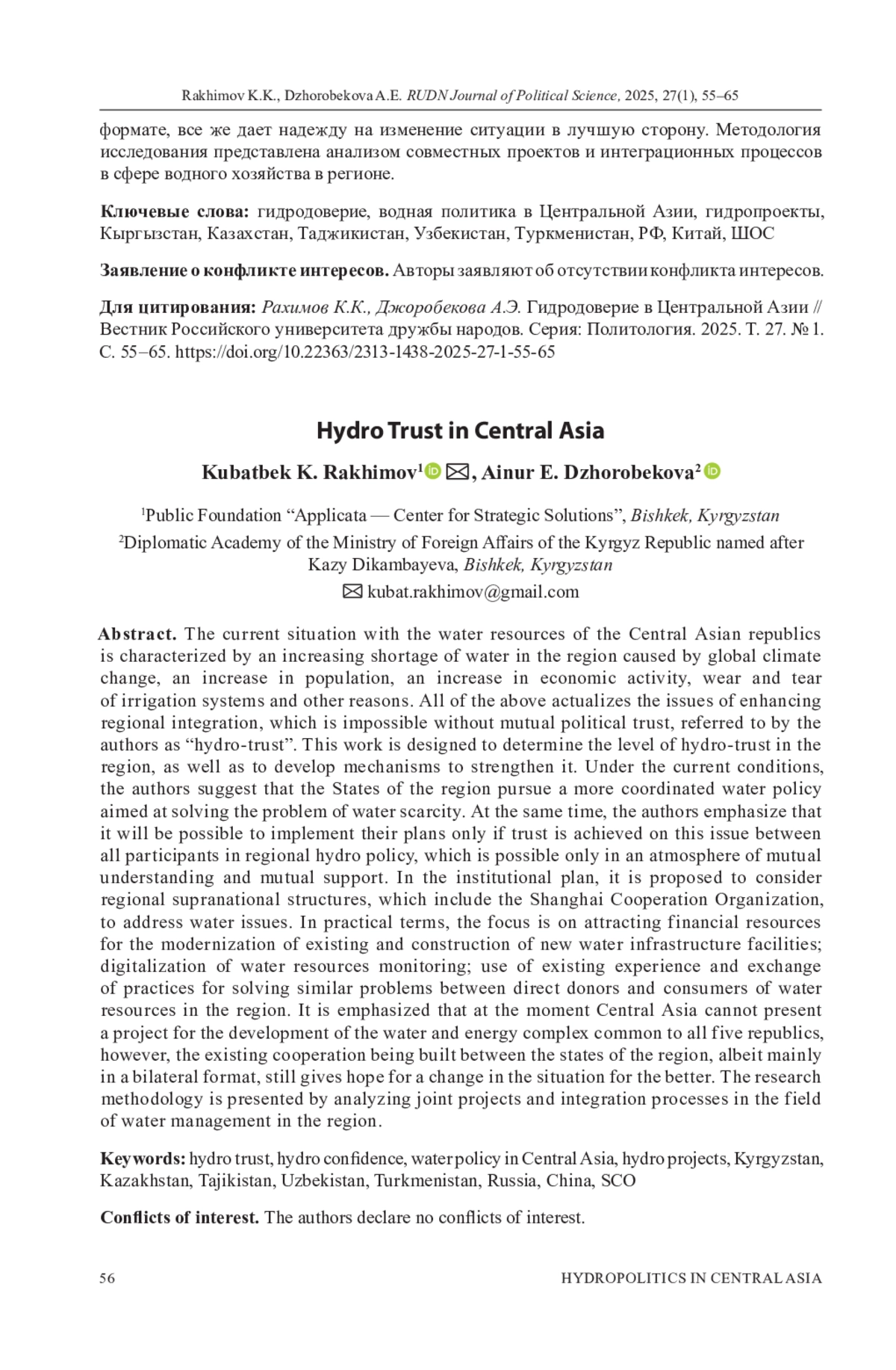 ДЖОРОБЕКОВА А. Э., РАХИМОВ К. К. ГИДРОДОВЕРИЕ В ЦЕНТРАЛЬНОЙ АЗИИ // ВЕСТНИК РОССИЙСКОГО УНИВЕРСИТЕТА ДРУЖБЫ НАРОДОВ. СЕРИЯ: ПОЛИТОЛОГИЯ. 2025. Т. 27 № 1