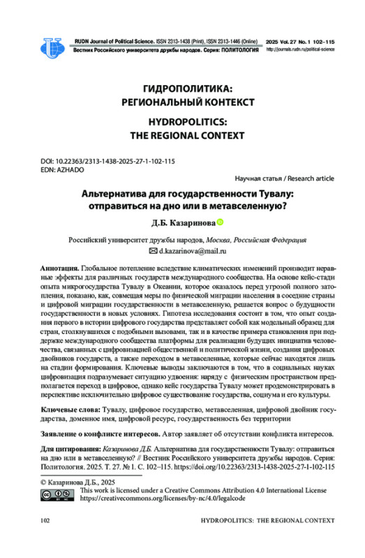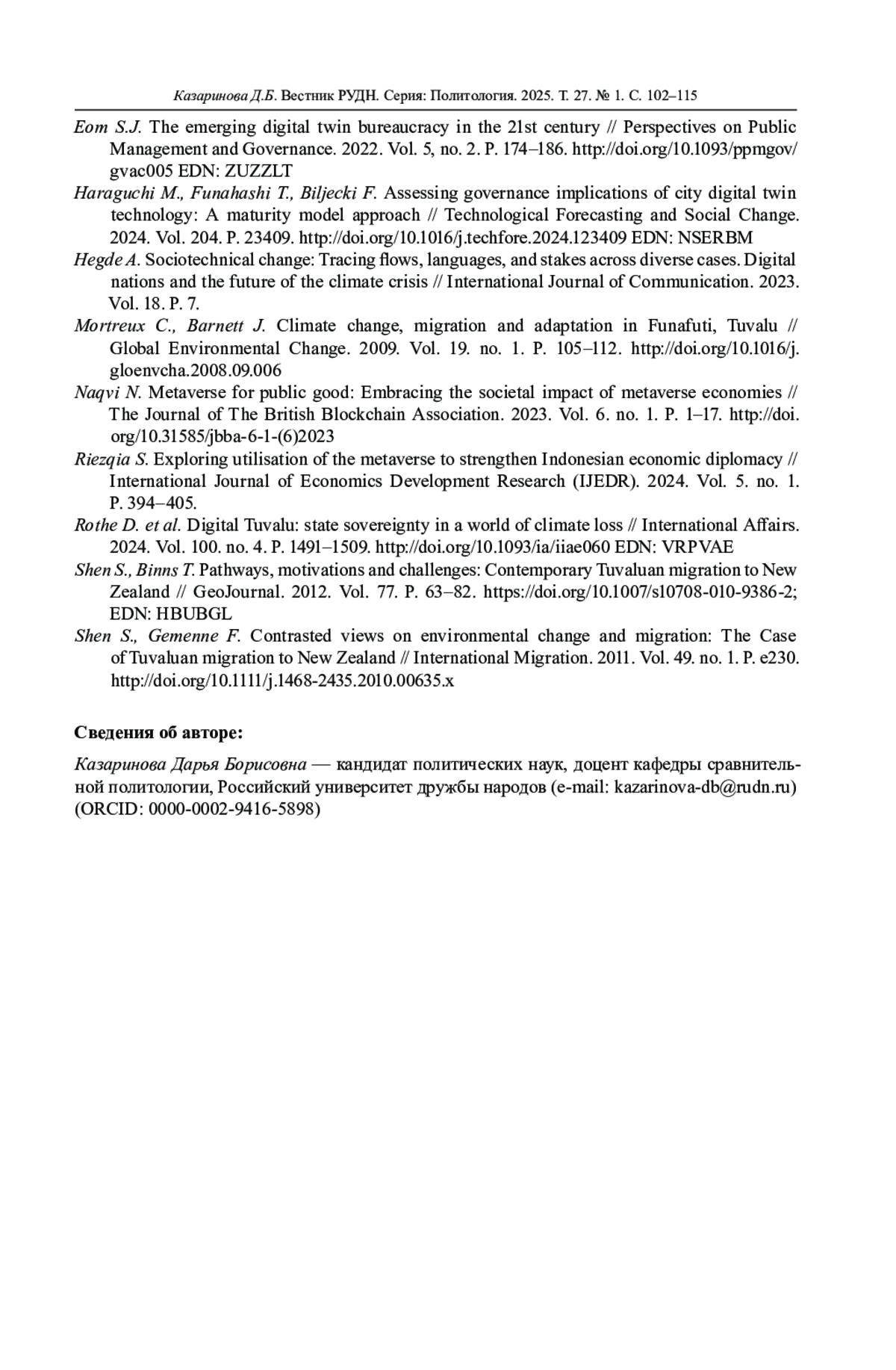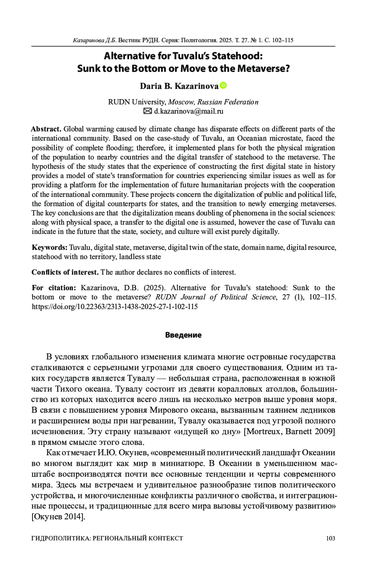 КАЗАРИНОВА Д. Б. АЛЬТЕРНАТИВА ДЛЯ ГОСУДАРСТВЕННОСТИ ТУВАЛУ: ОТПРАВИТЬСЯ НА ДНО ИЛИ В МЕТАВСЕЛЕННУЮ? // ВЕСТНИК РОССИЙСКОГО УНИВЕРСИТЕТА ДРУЖБЫ НАРОДОВ. СЕРИЯ: ПОЛИТОЛОГИЯ. 2025. Т. 27 № 1