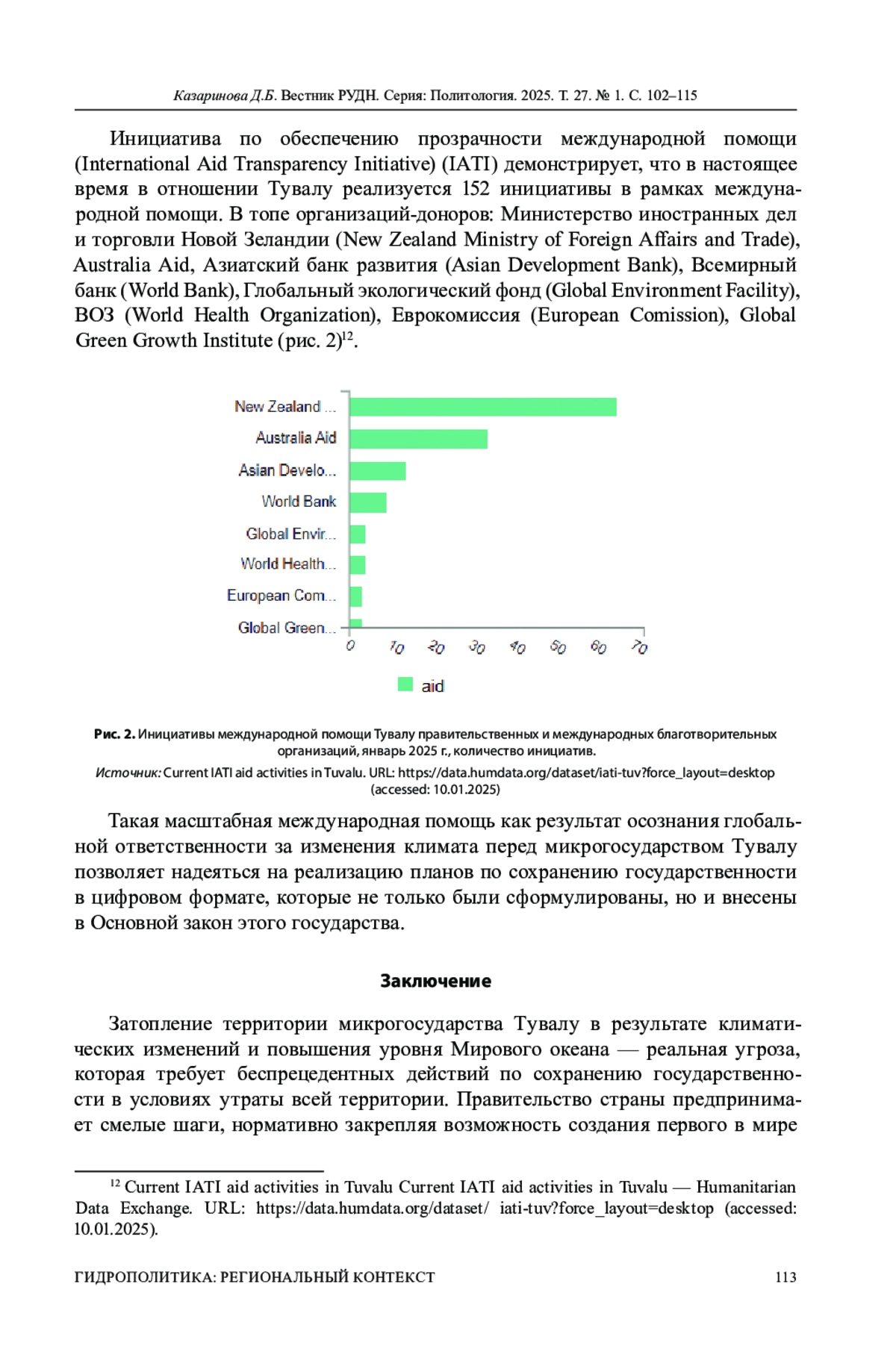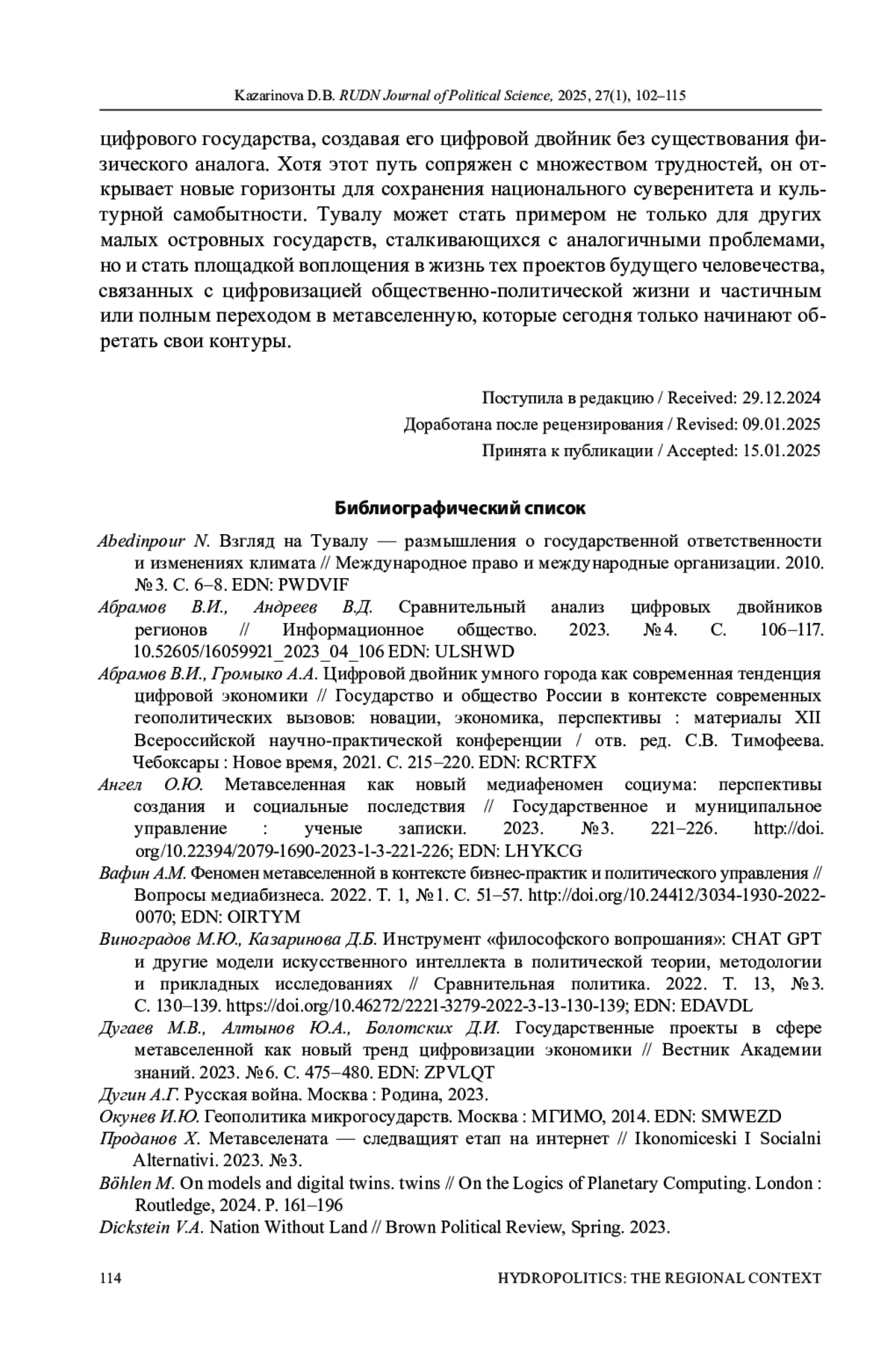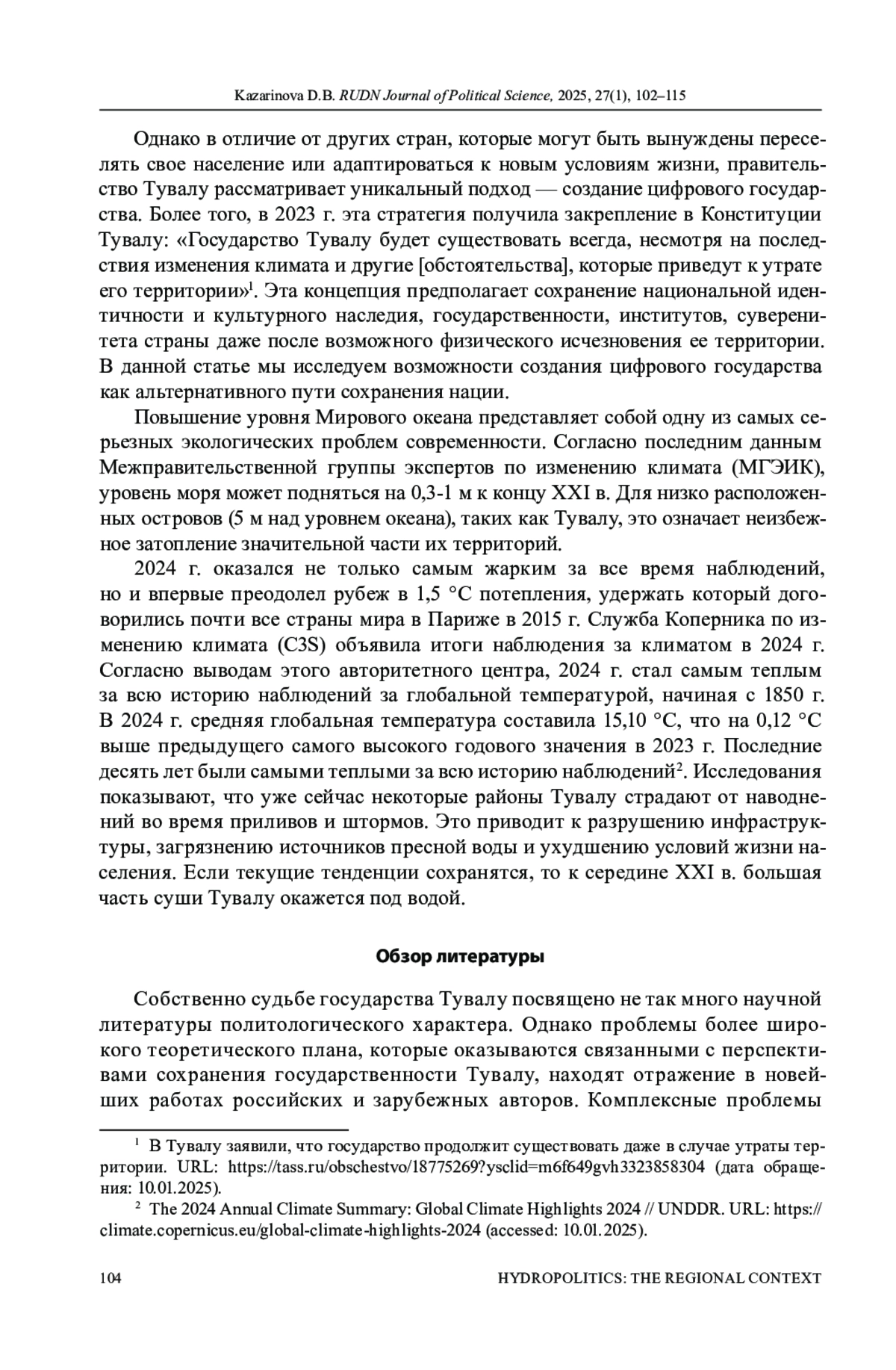 КАЗАРИНОВА Д. Б. АЛЬТЕРНАТИВА ДЛЯ ГОСУДАРСТВЕННОСТИ ТУВАЛУ: ОТПРАВИТЬСЯ НА ДНО ИЛИ В МЕТАВСЕЛЕННУЮ? // ВЕСТНИК РОССИЙСКОГО УНИВЕРСИТЕТА ДРУЖБЫ НАРОДОВ. СЕРИЯ: ПОЛИТОЛОГИЯ. 2025. Т. 27 № 1