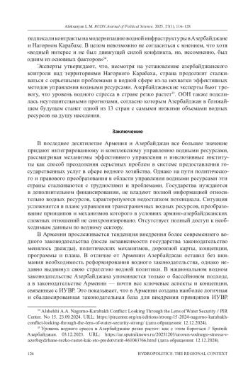 Армения и Азербайджан, находясь в составе Советского Союза, придерживались общих принципов управления водными ресурсами, предоставляли единую статистическую отчетность по использованию воды. Однако после приобретения независимости эти государства разработали собственные законы о воде, а также перестали обмениваться данными, полученными национальными гидрометеорологическими агентствами. Новая региональная реальность и сложные отношения между двумя странами препятствовали разработке общих механизмов по управлению трансграничных водных ресурсов, что привело к негативным последствиям для окружающей среды. Качество воды и ее эффективное управление стали одним из острых уголков неразрешенных проблем, существующих между двумя государствами. Исследование посвящено изучению водной политики Армении и Азербайджана. Проанализированы эффективность, а также недостатки управления водными ресурсами этих стран. Сделана попытка определить, насколько эффективен процесс внедрения принципов интегрированного управления водными ресурсами. На основе сравнительного анализа водного хозяйства Армении и Азербайджана установлены аналогии и отличия в законодательстве водной политики и политических механизмах водопользования этих стран.
