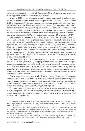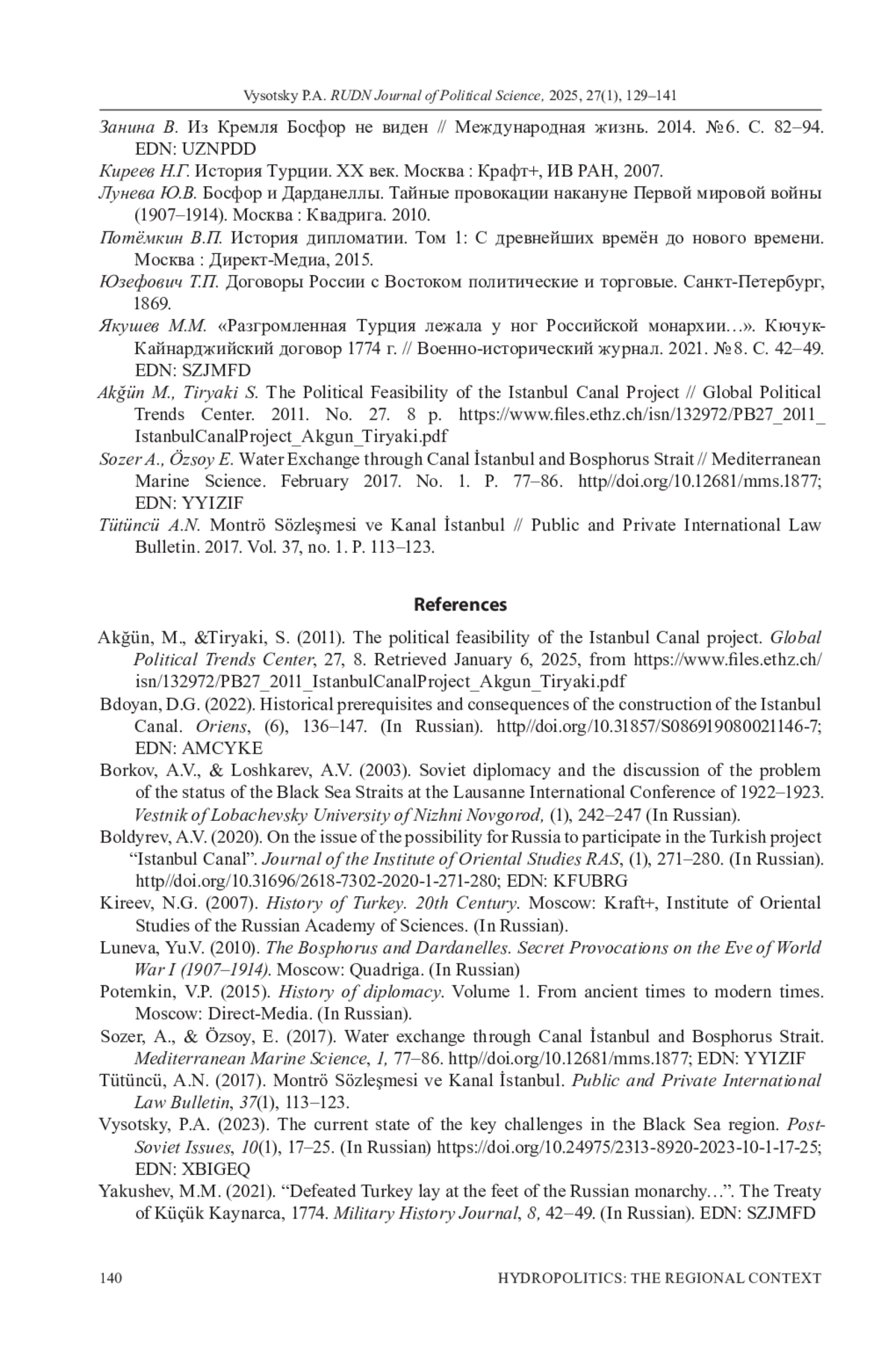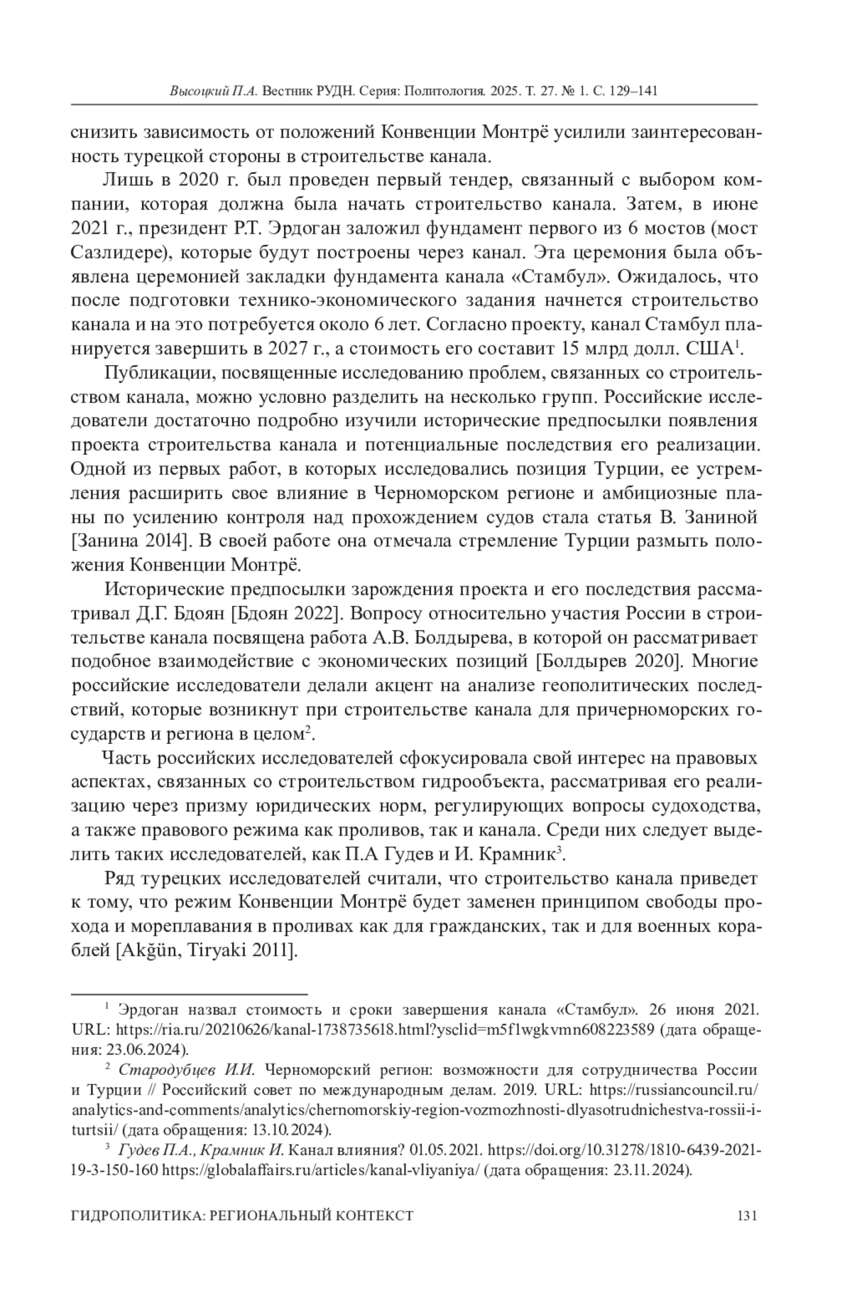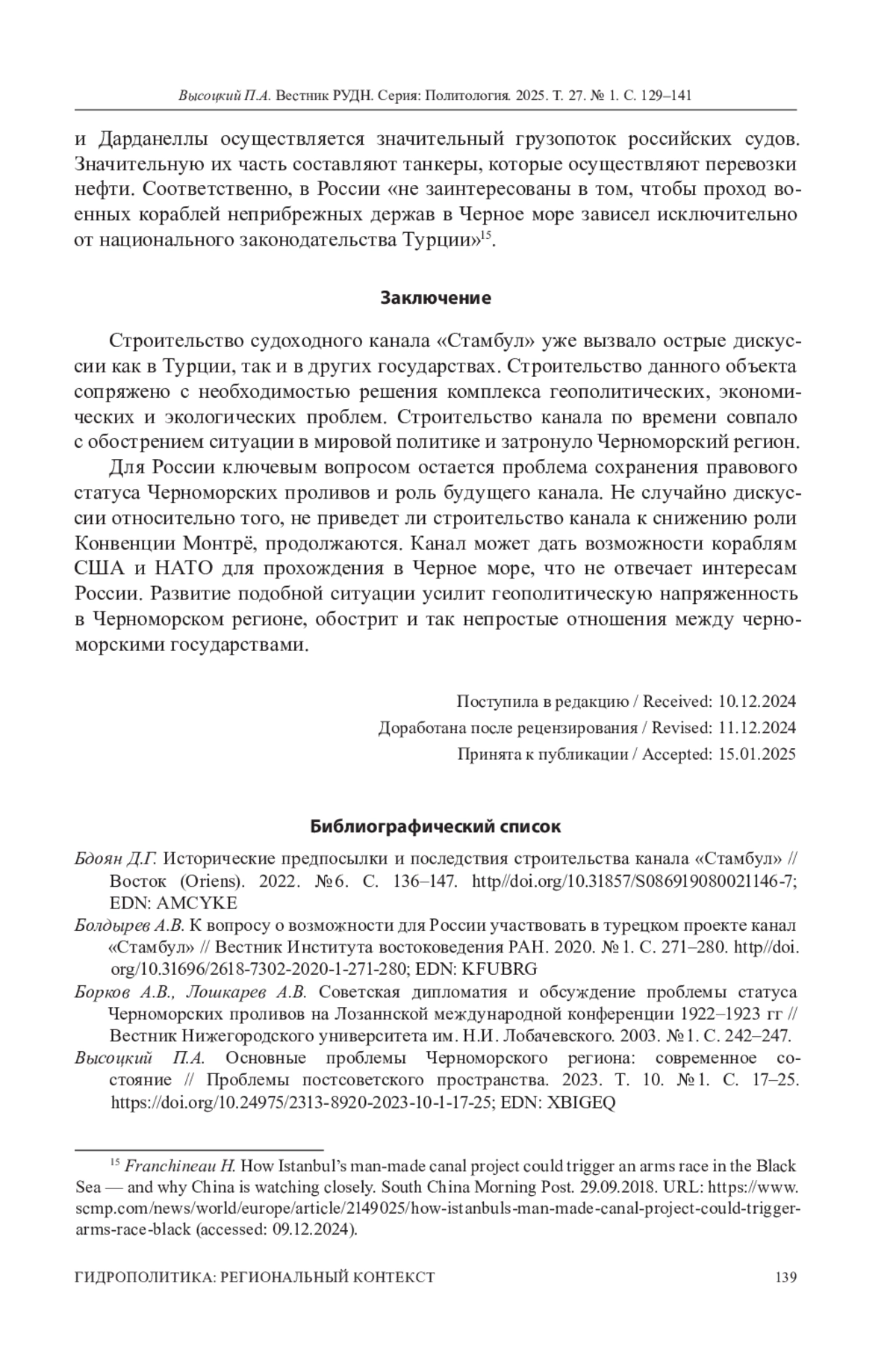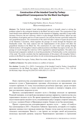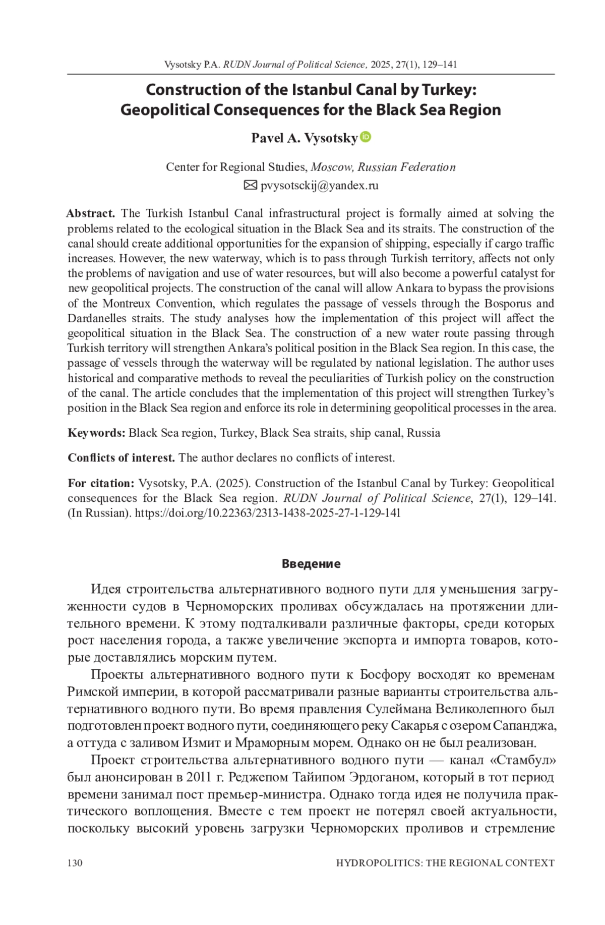 ВЫСОЦКИЙ П. А. ГЕОПОЛИТИЧЕСКИЕ ПОСЛЕДСТВИЯ ДЛЯ ЧЕРНОМОРСКОГО РЕГИОНА СТРОИТЕЛЬСТВА ТУРЦИЕЙ СУДОХОДНОГО КАНАЛА «СТАМБУЛ» // ВЕСТНИК РОССИЙСКОГО УНИВЕРСИТЕТА ДРУЖБЫ НАРОДОВ. СЕРИЯ: ПОЛИТОЛОГИЯ. 2025. Т. 27 № 1