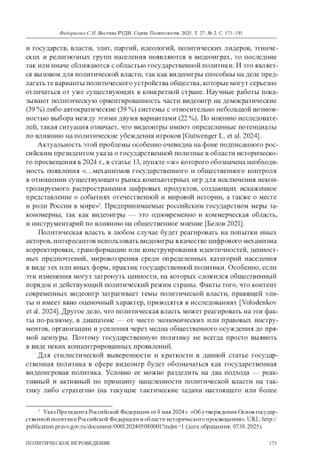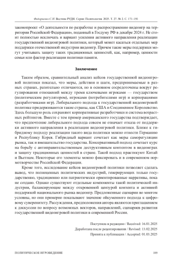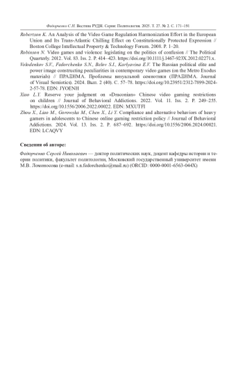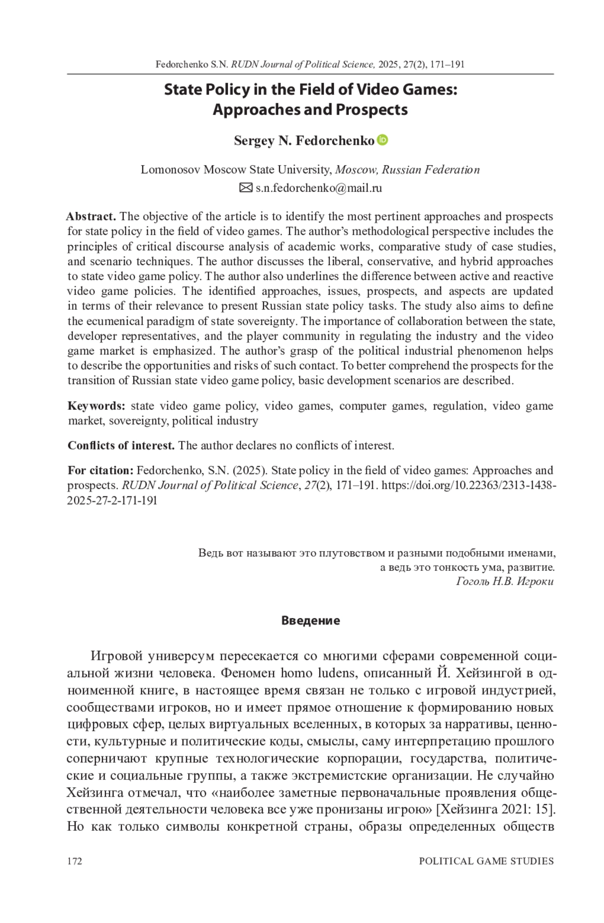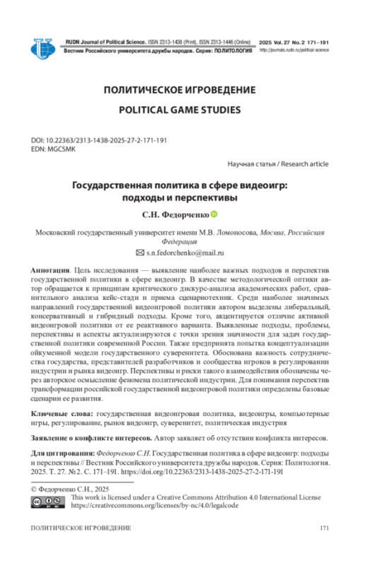 ФЕДОРЧЕНКО С. Н. ГОСУДАРСТВЕННАЯ ПОЛИТИКА В СФЕРЕ ВИДЕОИГР: ПОДХОДЫ И ПЕРСПЕКТИВЫ // ВЕСТНИК РОССИЙСКОГО УНИВЕРСИТЕТА ДРУЖБЫ НАРОДОВ. СЕРИЯ: ПОЛИТОЛОГИЯ. 2025. Т. 27 № 2