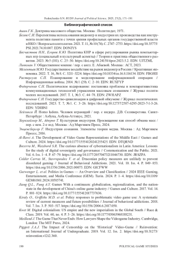 Ключевые фразы: государственная видеоигровая политика, ВИДЕОИГРЫ, КОМПЬЮТЕРНЫЕ ИГРЫ, регулирование, рынок видеоигр, суверенитет, политическая индустрия