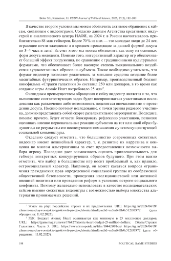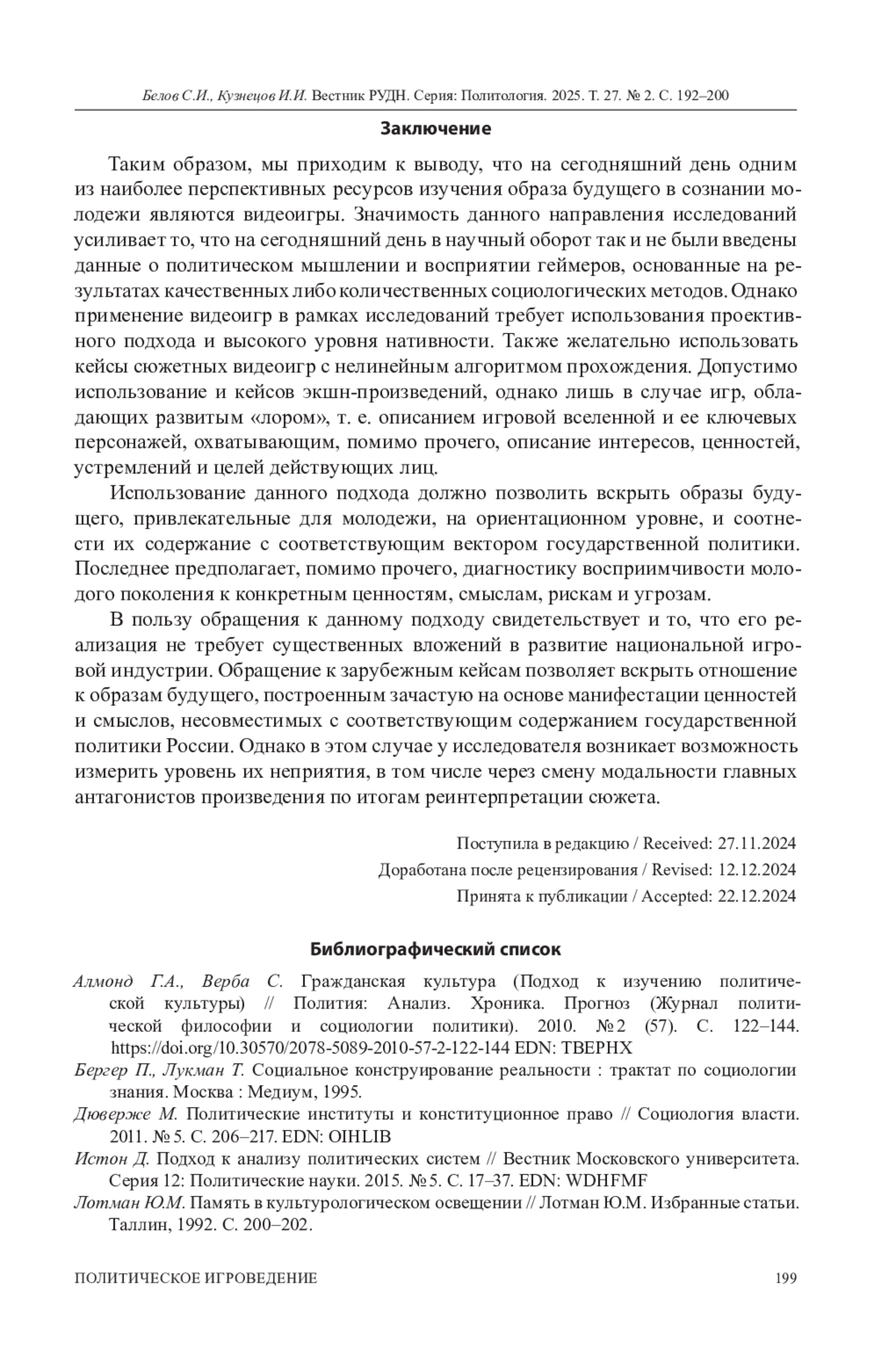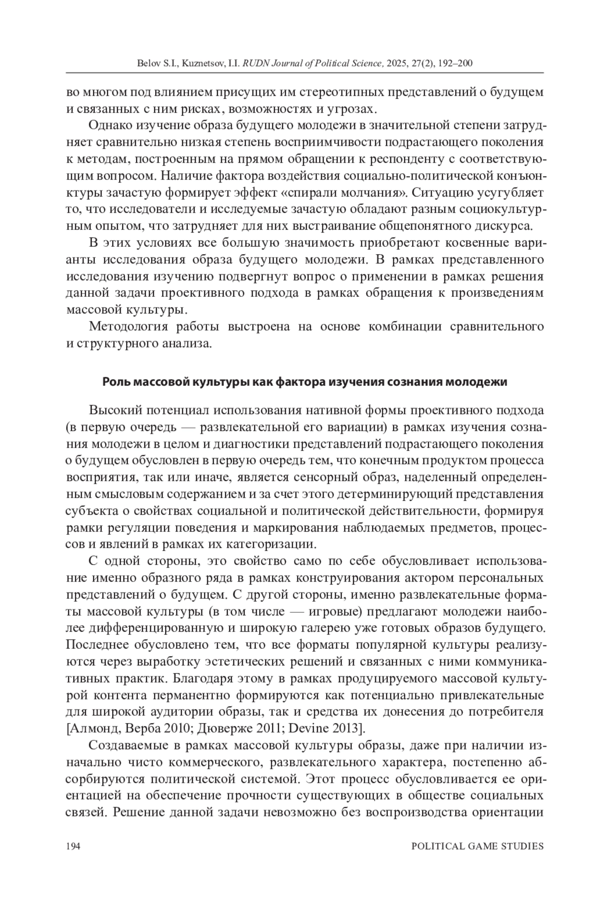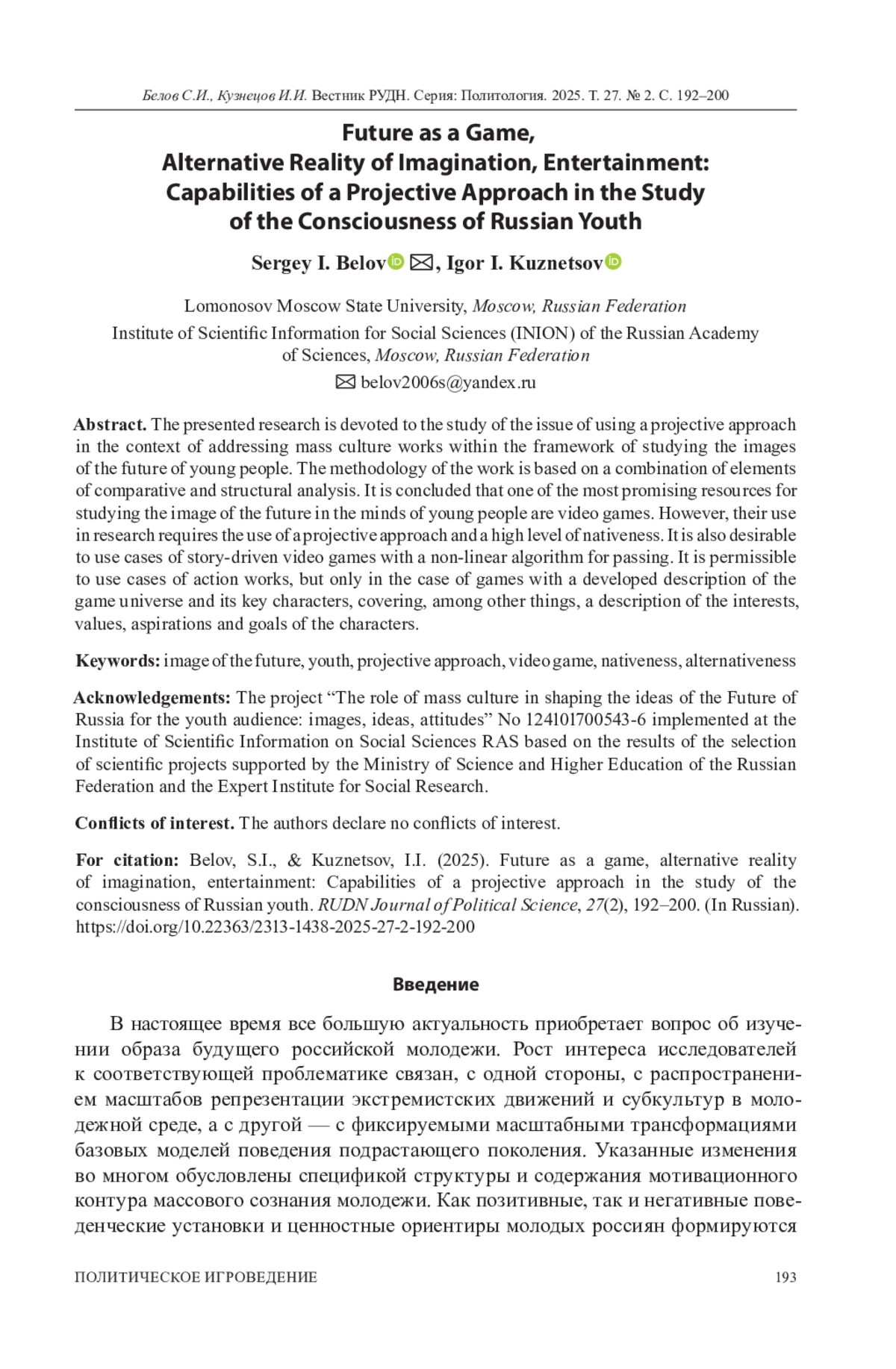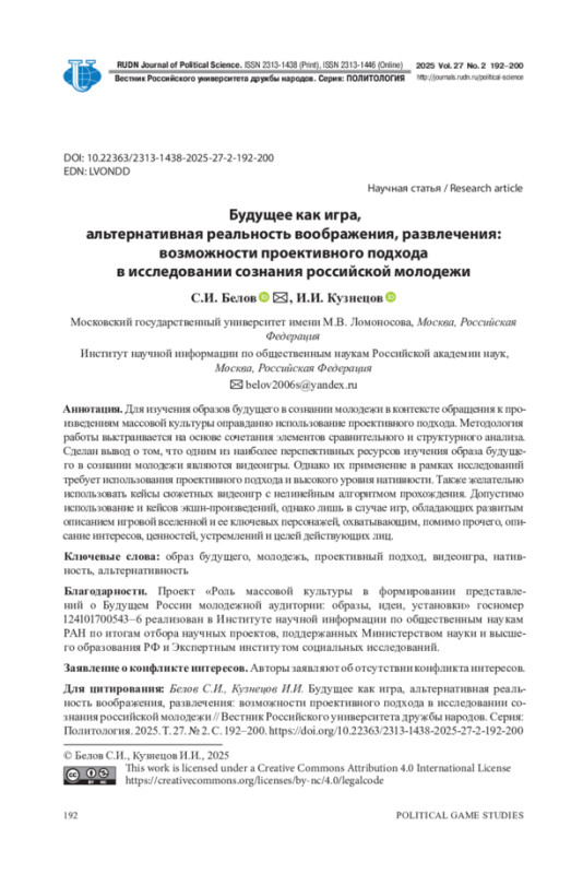БЕЛОВ С. И., КУЗНЕЦОВ И. И. БУДУЩЕЕ КАК ИГРА, АЛЬТЕРНАТИВНАЯ РЕАЛЬНОСТЬ ВООБРАЖЕНИЯ, РАЗВЛЕЧЕНИЯ: ВОЗМОЖНОСТИ ПРОЕКТИВНОГО ПОДХОДА В ИССЛЕДОВАНИИ СОЗНАНИЯ РОССИЙСКОЙ МОЛОДЕЖИ // ВЕСТНИК РОССИЙСКОГО УНИВЕРСИТЕТА ДРУЖБЫ НАРОДОВ. СЕРИЯ: ПОЛИТОЛОГИЯ. 2025. Т. 27 № 2
