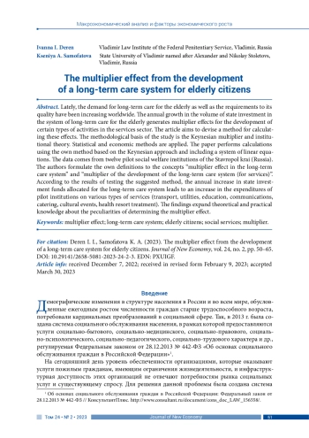 В последнее время во всем мире растет численность пожилых людей, нуждающихся в длительном уходе, и повышаются требования к его качеству. В свою очередь, ежегодное увеличение объема государственных инвестиций в систему долговременного ухода за гражданами старшего поколения порождает мультипликативные эффекты в различных сферах предоставления услуг. Статья посвящена разработке методики расчета данных эффектов. Методология исследования базируется на теории мультипликатора Дж. Кейнса и положениях институциональной теории. Использовались статистикоэкономические методы. Расчет производился с помощью авторской методики, основанной на кейнсианском подходе, с применением системы линейных уравнений. Информационную основу работы составили данные двенадцати пилотных учреждений социального обслуживания населения Ставропольского края. Сформулированы авторские определения понятий «мультипликативный эффект в системе долговременного ухода» и «мультипликатор развития системы долговременного ухода (на примере услуг)». Апробация предложенной методики показала, что ежегодное увеличение государственных инвестиций на реализацию системы долговременного ухода ведет к увеличению расходов учреждений на разные виды услуг (транспортных, коммунальных, образовательных, связи, услуг по организации питания, проведению культурных мероприятий, санаторнокурортному лечению). Результаты исследования вносят вклад в расширение теоретических и практических знаний об особенностях определения мультипликативного эффекта.