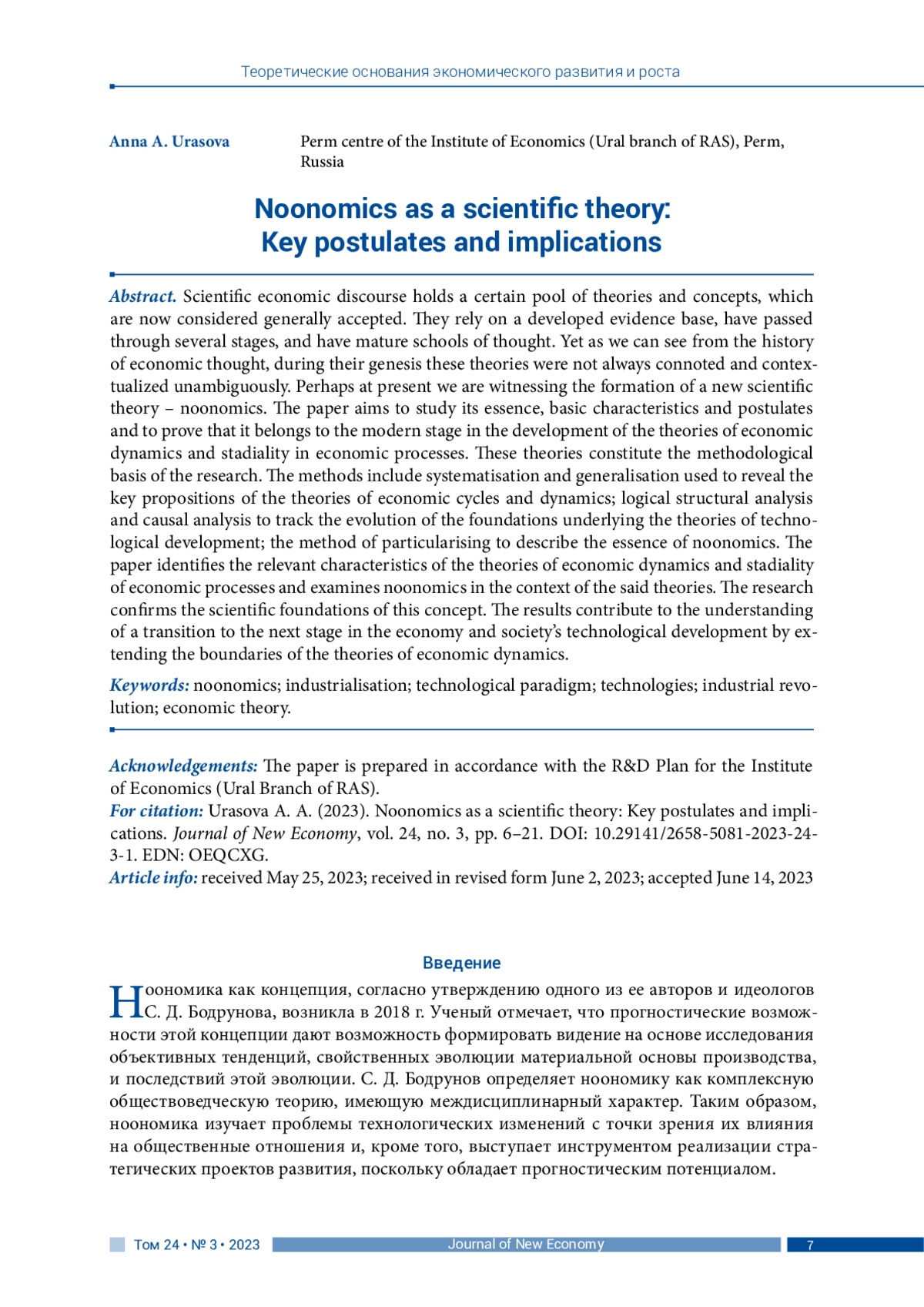 В научном экономическом дискурсе сформировался определенный пул теорий и концепций, которые считаются общепринятыми, имеющими разработанную доказательную базу, этапы формирования, развитые научные школы и пр. Однако, как показывает история экономической мысли, не всегда в своем генезисе данные теории имели однозначную коннотацию и контекстуализацию. Возможно, в настоящее время мы становимся свидетелями формирования новой научной теории – ноономики. Статья посвящена изучению ее сущностных положений и смыслов и обоснованию ее принадлежности к современному этапу развития теорий экономической динамики и стадиальности экономических процессов. Методологической базой исследования послужили указанные теории. Методами работы выступили систематизация и обобщение в части раскрытия ключевых положений теорий экономической цикличности и динамики; логико-структурный и причинно-следственный анализ в части исследования эволюции базиса теорий технологического развития; метод конкретизации в части раскрытия сущностни ноономики. Выделены релевантные характеристики теорий экономической динамики и стадиальности экономических процессов и выполнен анализ ноономики в контексте данных характеристик. Показано, что рассмотренная научная концепция по основным критериям относится к разработкам, обосновывающим переходный этап экономического развития, и является частью указанных теорий. Подтверждена научная основа данной концепции. Результаты исследования вносят вклад в понимание перехода на следующий этап технологического развития экономики и общества в целом, расширяя границы научного познания через призму теорий экономической динамики