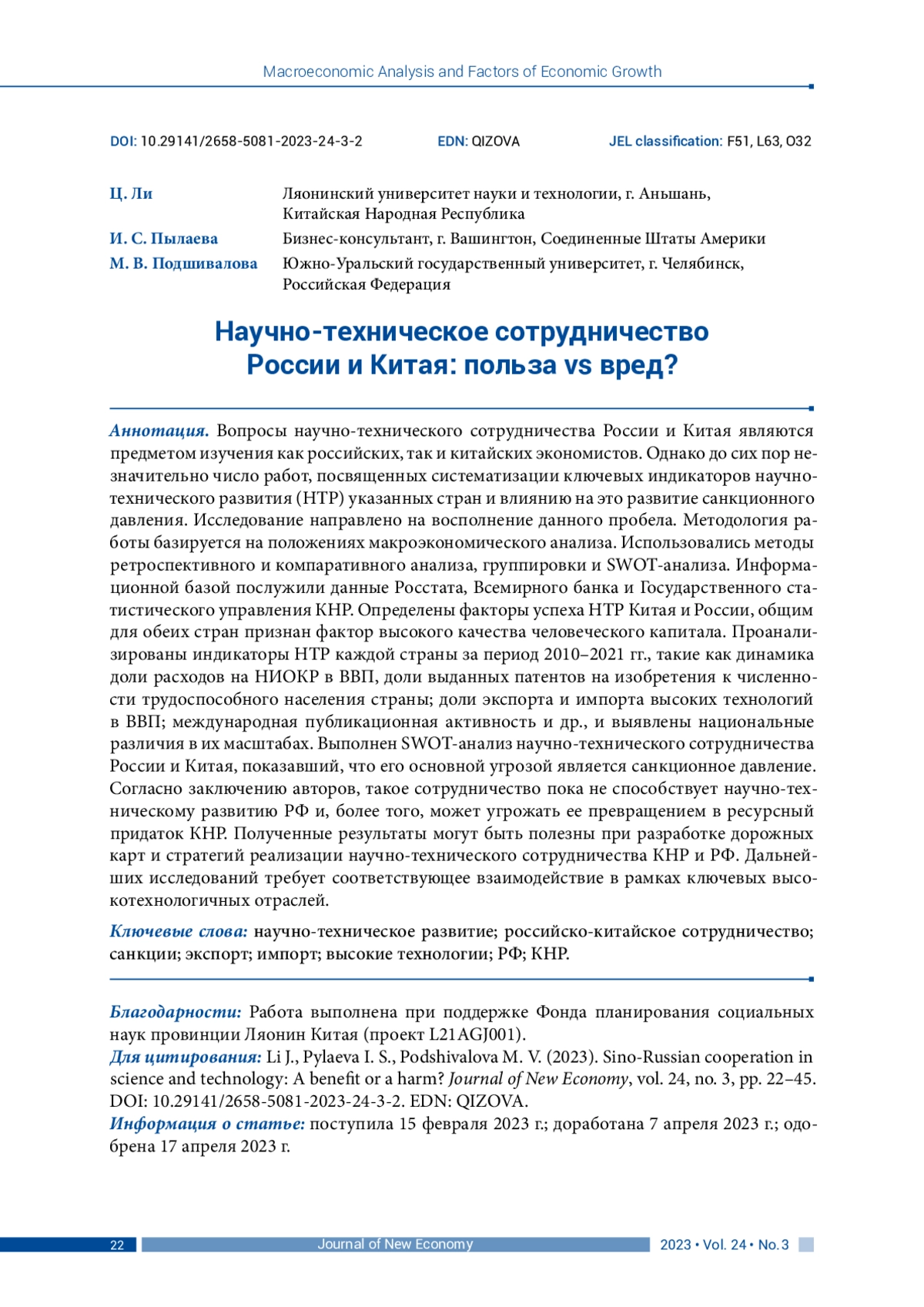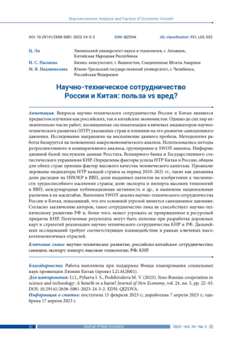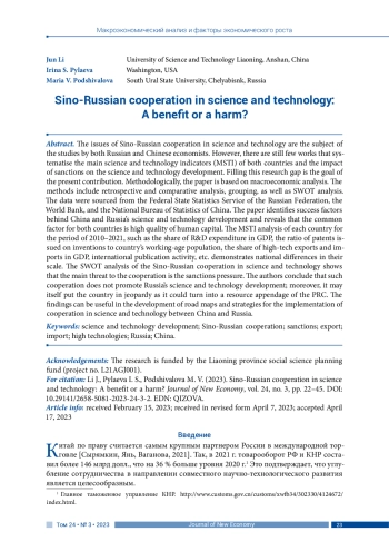Вопросы научно-технического сотрудничества России и Китая являются предметом изучения как российских, так и китайских экономистов. Однако до сих пор незначительно число работ, посвященных систематизации ключевых индикаторов научнотехнического развития (НТР) указанных стран и влиянию на это развитие санкционного давления. Исследование направлено на восполнение данного пробела. Методология работы базируется на положениях макроэкономического анализа. Использовались методы ретроспективного и компаративного анализа, группировки и SWOT-анализа. Информационной базой послужили данные Росстата, Всемирного банка и Государственного статистического управления КНР. Определены факторы успеха НТР Китая и России, общим для обеих стран признан фактор высокого качества человеческого капитала. Проанализированы индикаторы НТР каждой страны за период 2010–2021 гг., такие как динамика доли расходов на НИОКР в ВВП, доли выданных патентов на изобретения к численности трудоспособного населения страны; доли экспорта и импорта высоких технологий в ВВП; международная публикационная активность и др., и выявлены национальные различия в их масштабах. Выполнен SWOT-анализ научно-технического сотрудничества России и Китая, показавший, что его основной угрозой является санкционное давление. Согласно заключению авторов, такое сотрудничество пока не способствует научно-техническому развитию РФ и, более того, может угрожать ее превращением в ресурсный придаток КНР. Полученные результаты могут быть полезны при разработке дорожных карт и стратегий реализации научно-технического сотрудничества КНР и РФ. Дальнейших исследований требует соответствующее взаимодействие в рамках ключевых высокотехнологичных отраслей