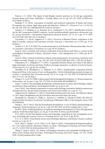 28. Feng C. P. (2014). The sustainable development countermeasures to science and technology cooperation between China and Russia. World Regional Studies, no. 4, pp. 61-69.